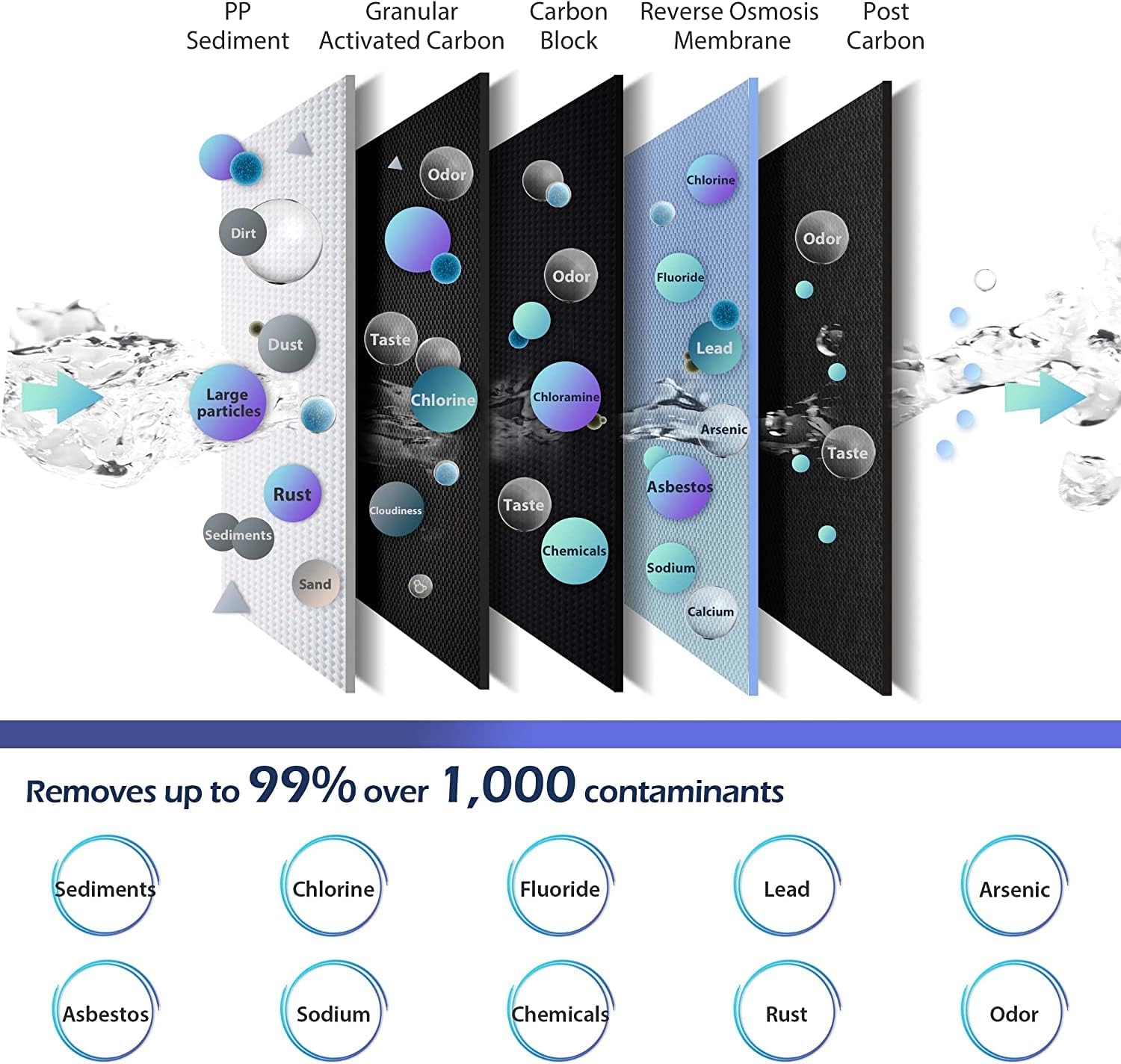 - EFFECTIVELY REMOVE CONTAMINANTS - The iSpring RO system delivers clean, pure, and great-tasting drinking water by removing up to 99% of over 1,000 harmful contaminants, including PFAS, chlorine, fluoride, lead (up to 98%), arsenic, asbestos, calcium, and sodium. It also reduces TDS by 80-90% and removes hard water minerals that cause scale buildup.