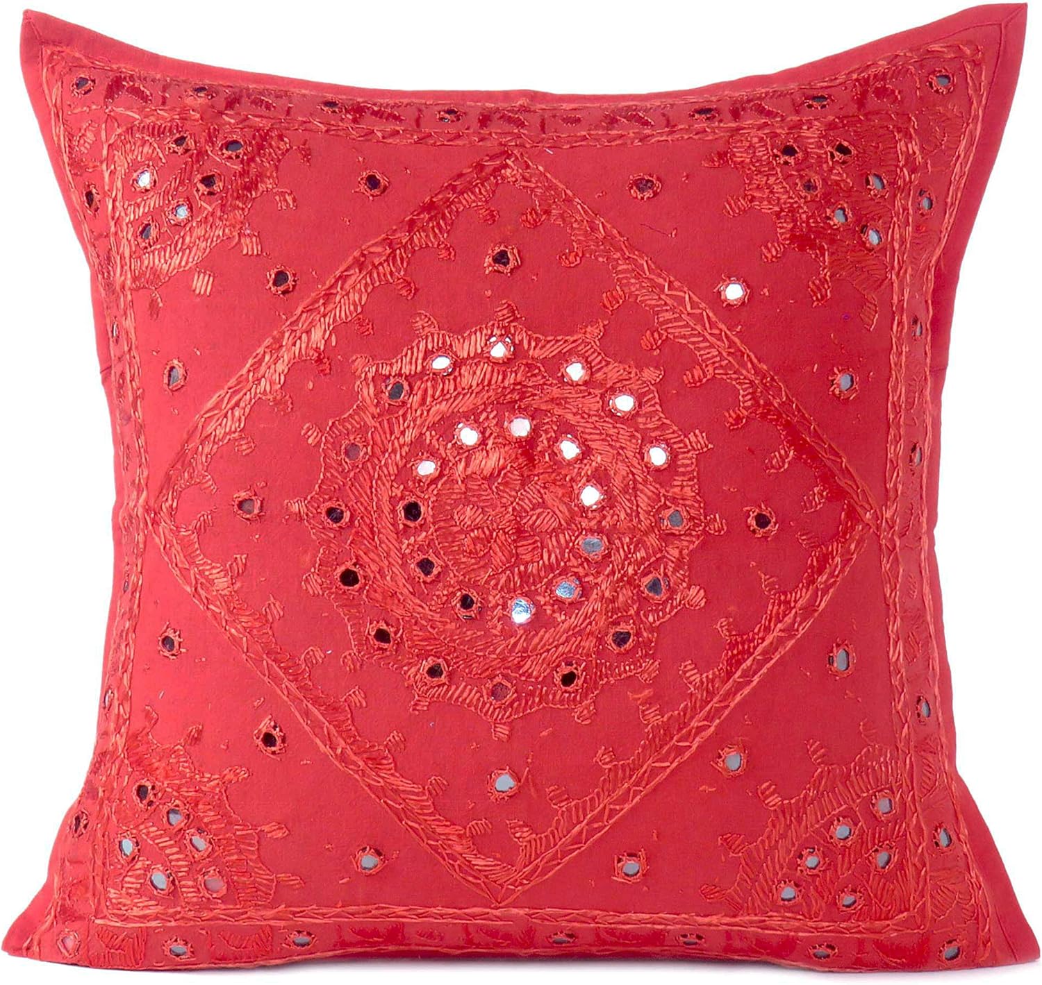 Eyes of India Embroidered Decorative Boho Throw Pillow Cover with Mirrors, Handmade Bohemian Accent Cushion Case for Sofa Couch Bedroom Living Room (Red, 24" x 24")