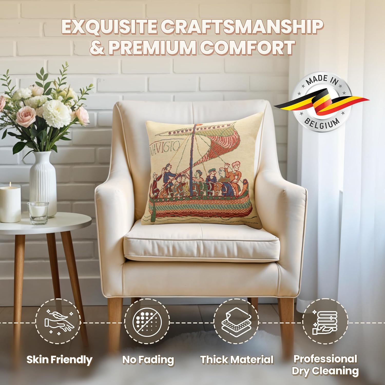 - Medieval Ship Design Inspired By Bayeux Tapestry – Depicting a detailed nautical scene from the famed Bayeux Tapestry, this woven cushion cover brings the drama of medieval voyages into your home décor. The bold ship motif, inspired by Norman naval history, adds a historical statement to any sofa, couch, or reading corner.