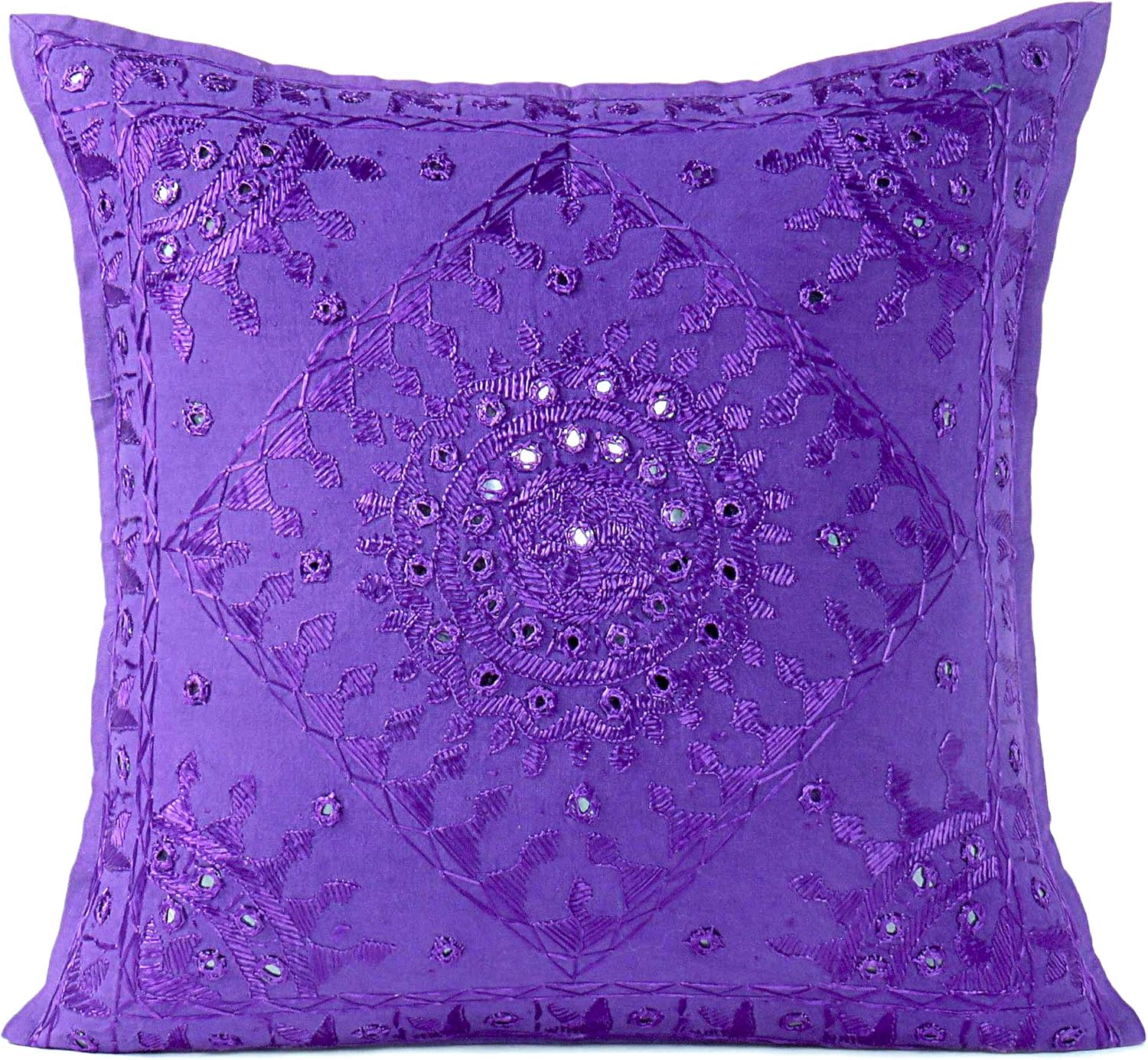 Eyes of India Embroidered Decorative Boho Throw Pillow Cover with Mirrors, Handmade Bohemian Accent Cushion Case for Sofa Couch Bedroom Living Room (Purple, 24" x 24")