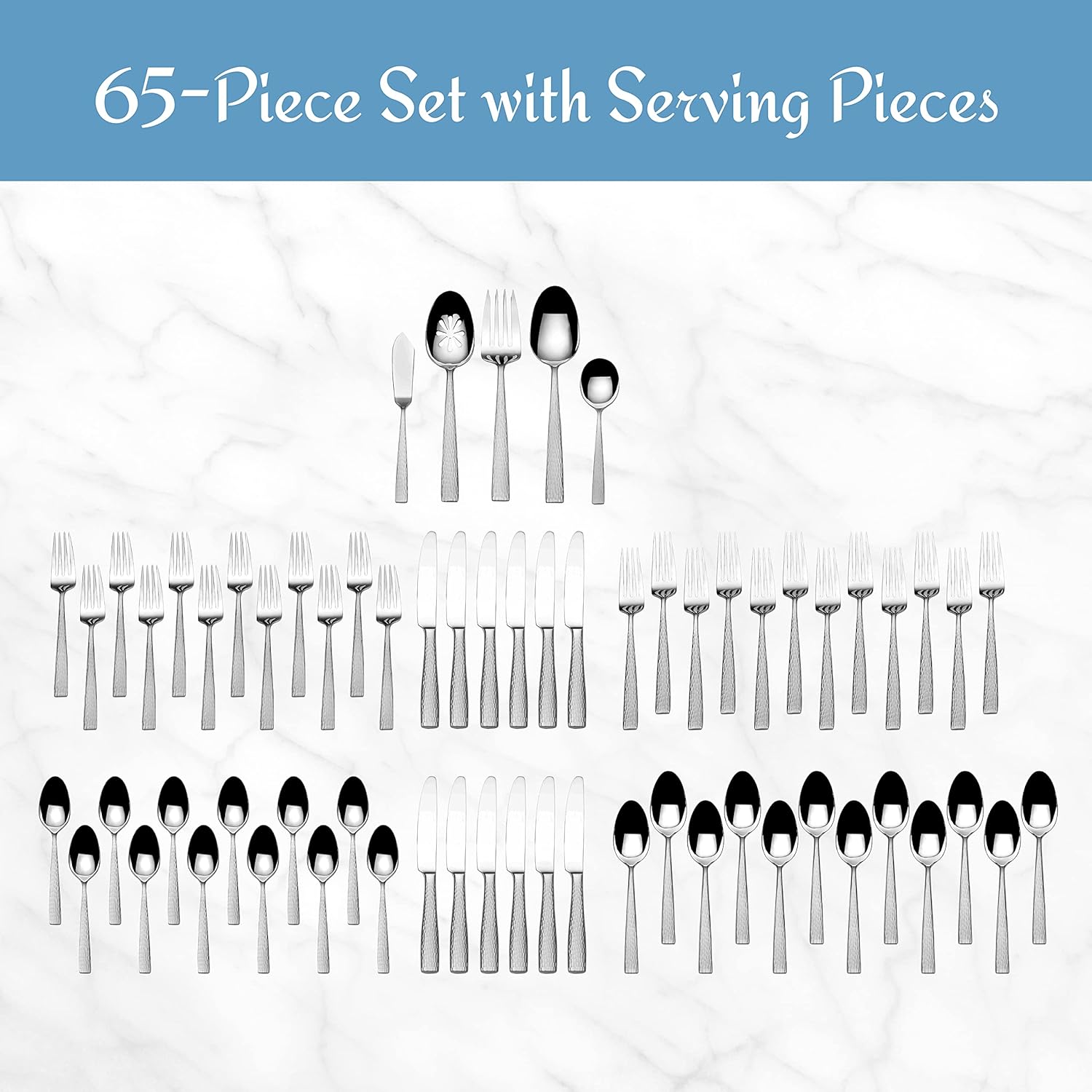 - PERFECT FOR LARGE GATHERINGS: 65-piece set, service for 12, includes 12 each of: dinner fork, salad fork, dinner knife, dinner spoon, and teaspoon, plus 1 each of serving tablespoon, pierced tablespoon, cold meat fork, butter knife, and sugar spoon