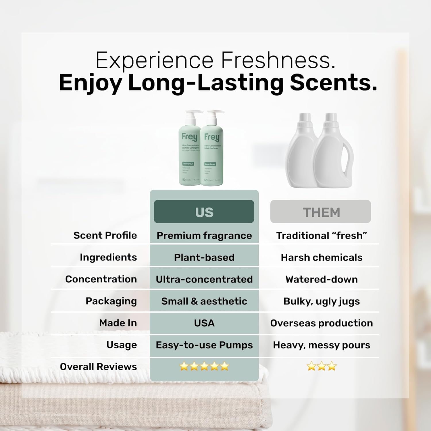 - LONG LASTING DETERGENT THAT'S SAFE FOR YOU - FREY's powerful concentrated laundry detergent liquid is formulated to last a long time and is also made without harsh ingredients, making it safe for you and your clothes. The perfect pairing to our fabric softener, the FREY detergent includes ingredients like Cedarwood, Oakmoss and Amber and is HE compatible.