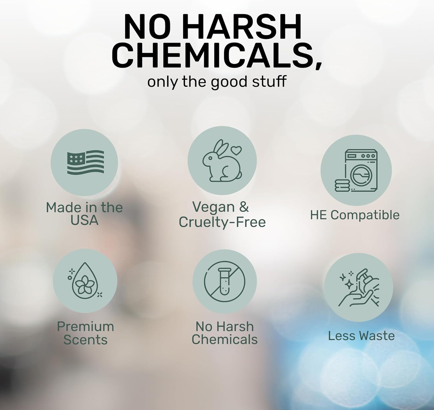 - YOUR CLOTHES WILL LOVE IT - We designed this concentrated blend of gentle washing detergents and natural fragrances to soften and reduce wrinkles and eliminate odors, stains, and dirt. Our high efficiency laundry detergent is ideal for everyday laundry, including cottons, linens, blends, and durable synthetics. It's also safe for whites and all colors, and you can use it in hot, cold, hard, or soft water.