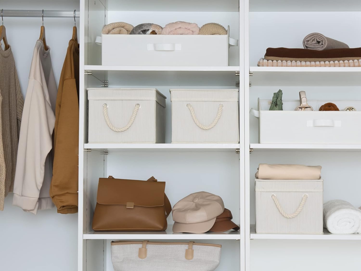 StorageWorks Large Storage Bins with Lids, Decorative Storage Boxes with Lid and Soft Rope Handles, Foldable Storage Baskets for Closet, Shelves, Stackable, Ivory and White, 3-Pack