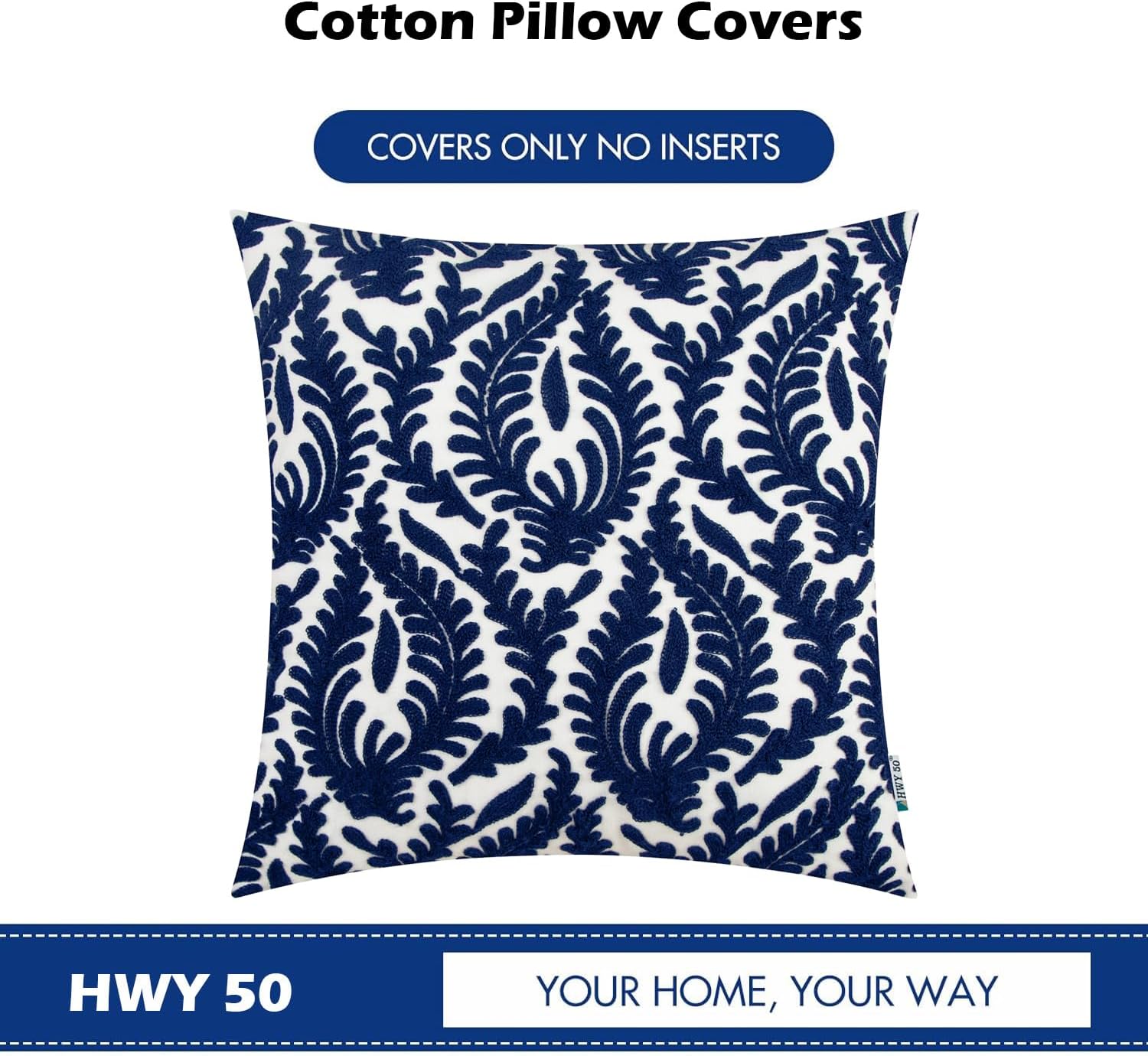 HWY 50 Navy Blue Decorative Throw Pillow Covers 18x18 Inch (1 Piece), Embroidered Cotton Farmhouse Cushion Cover Pillow Case for Sofa Couch Living Room Bed Bedroon, Floral Branches
