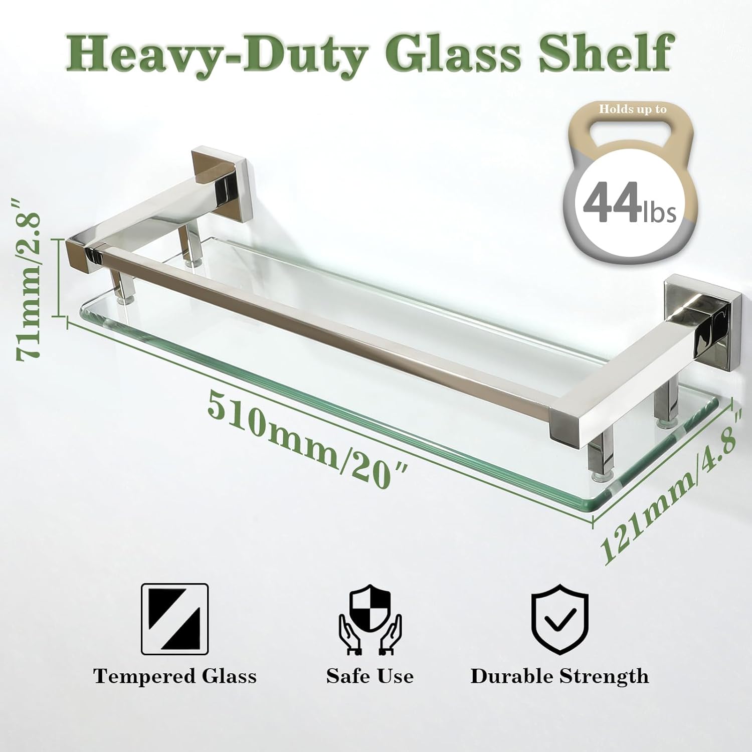 - TEMPERED GLASS:Our glass shelves are made with ultra-strong 8mm tempered glass and SUS304 stainless steel, ensuring a weight capacity that far exceeds standard shelves for reliable support