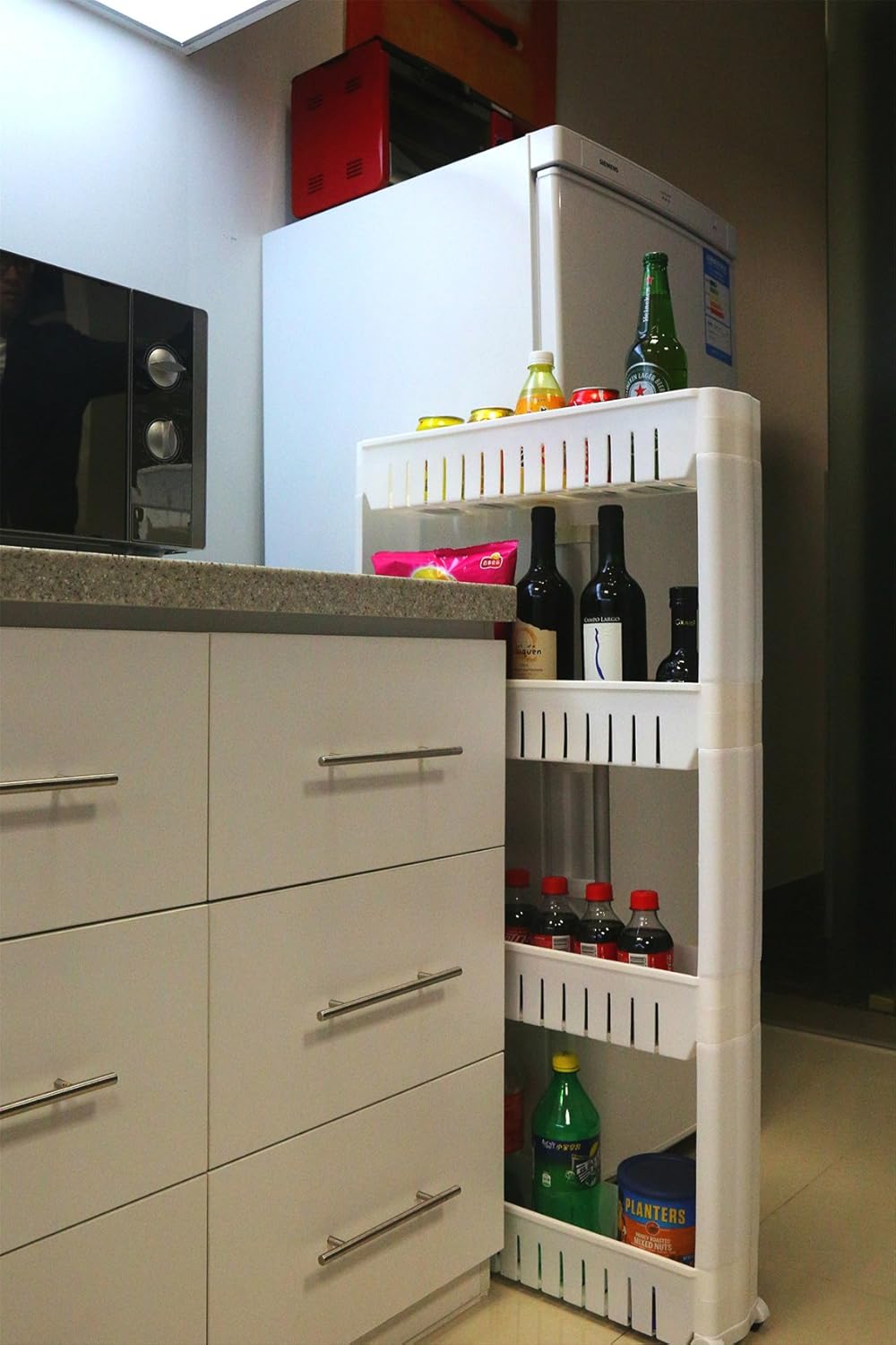 - 4 TIER SHELVING FOR MULTIPLE USES - Mobile shelving unit organizers are perfect for the tiny space between your washer and dryer, or between your desk and wall, in closet, laundry room, nursery, corners, restrooms, bedrooms, washrooms, pantry, garage or under stairs, beside a table or wherever else you need some shelves.