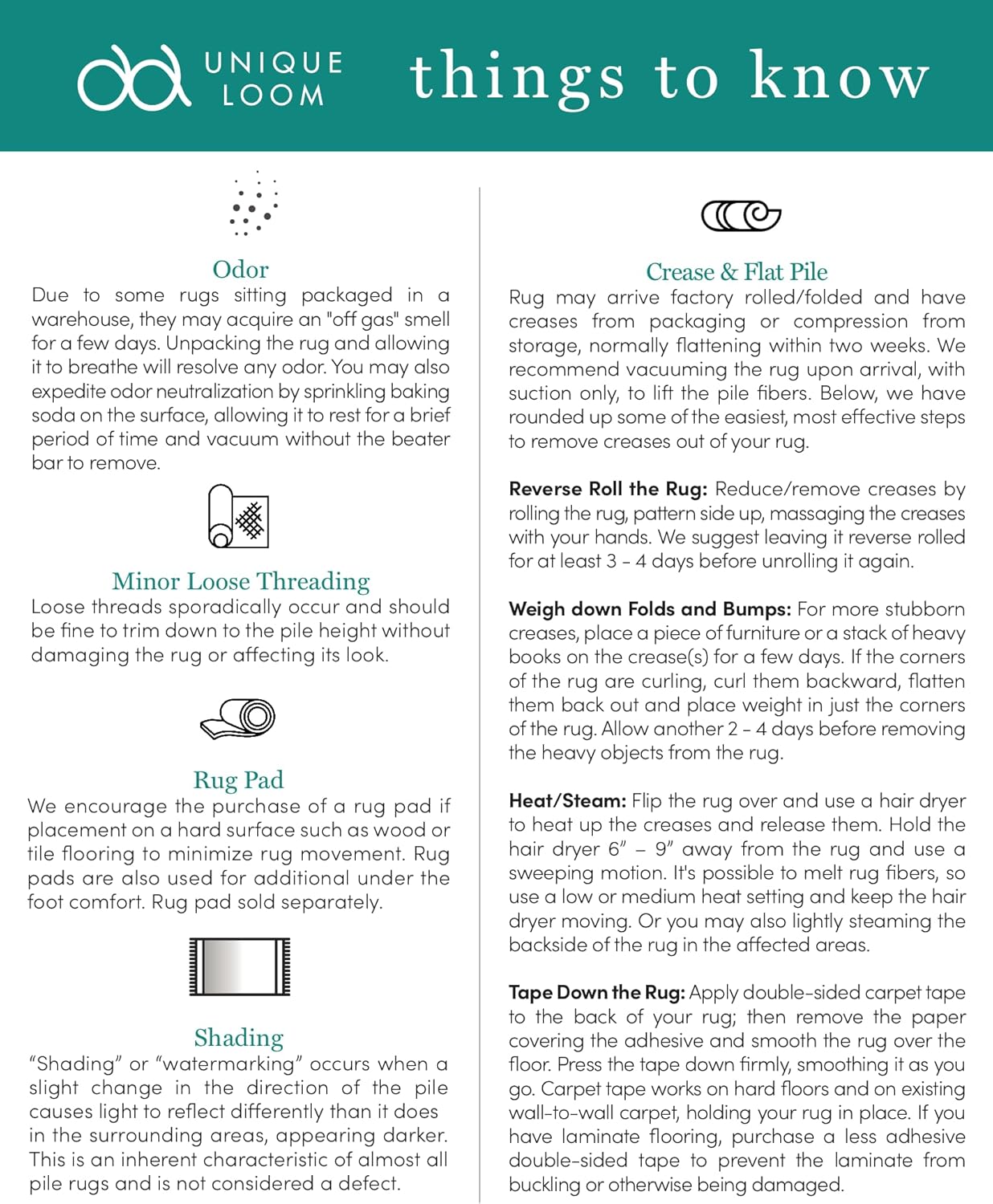 - Easy-to-clean and does not shed - underlay (rug pad) recommended to prevent slipping and sliding