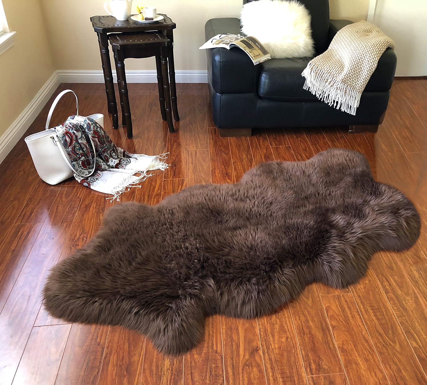 - MULTIPURPOSE DESIGN REAL SHEEPSKIN RUG: The sheepskin rugs are multipurpose and used as seat covers rug, couch pads, and area carpets. The stain-resistant, latex-free rug is designed for daily indoor use faux fur that is a super soft material rug under your feet. This free shape silky shag rug that works with a wide variety of decors great addition for kid’s room rug.