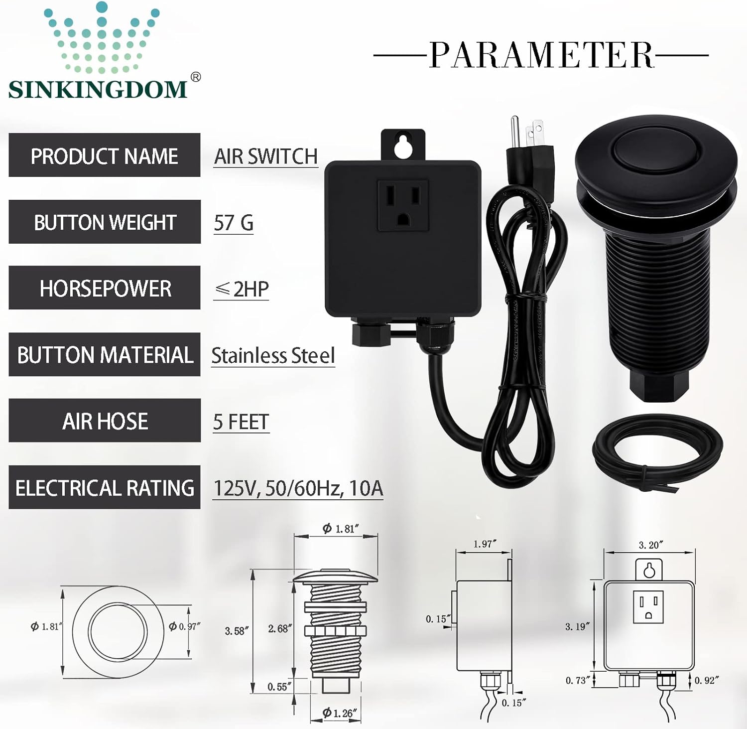 - Digital: 3.20"x 3.19"x 1.97" Power Adapter, 60.00" Air Tube and 40.00" Power Cable, 3.58"x 1.25" Air Switch Adapter Button, 1-1/4"Countertop Hole at Least, 2HP, UL Certification.