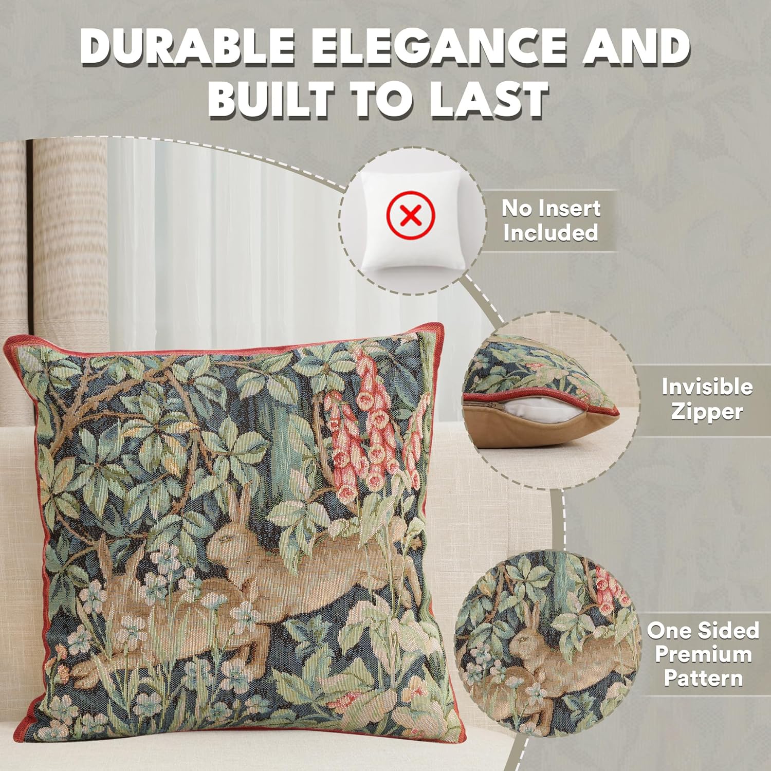 Charlotte Home Furnishings Decorative Tapestry Pillow Cover 14x14 in, Green Hares Couch Throw Pillow Cover, French Country Square Cushion Cases for Living Room Home Decor, Soft Cotton Jacquard Woven