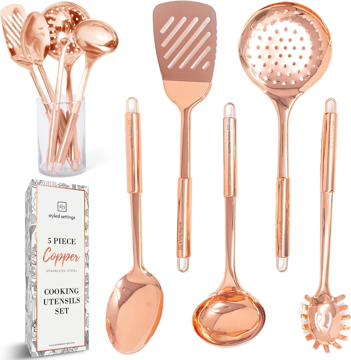 - ✔MAKE YOUR KITCHEN SHINE WITH THIS COMPLETE SET OF BEAUTIFUL STAINLESS STEEL COPPER UTENSILS – outfit your kitchen with this five piece set of stylish and sophisticated rose gold / copper kitchen utensils; includes serving spoon, pasta serving fork, slotted spatula / turner, kitchen skimmer and soup ladle; combine with our white cement utensil holder for an impeccable countertop look