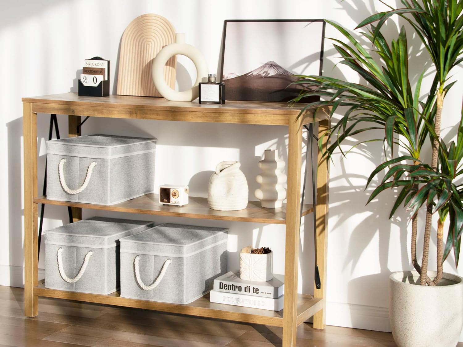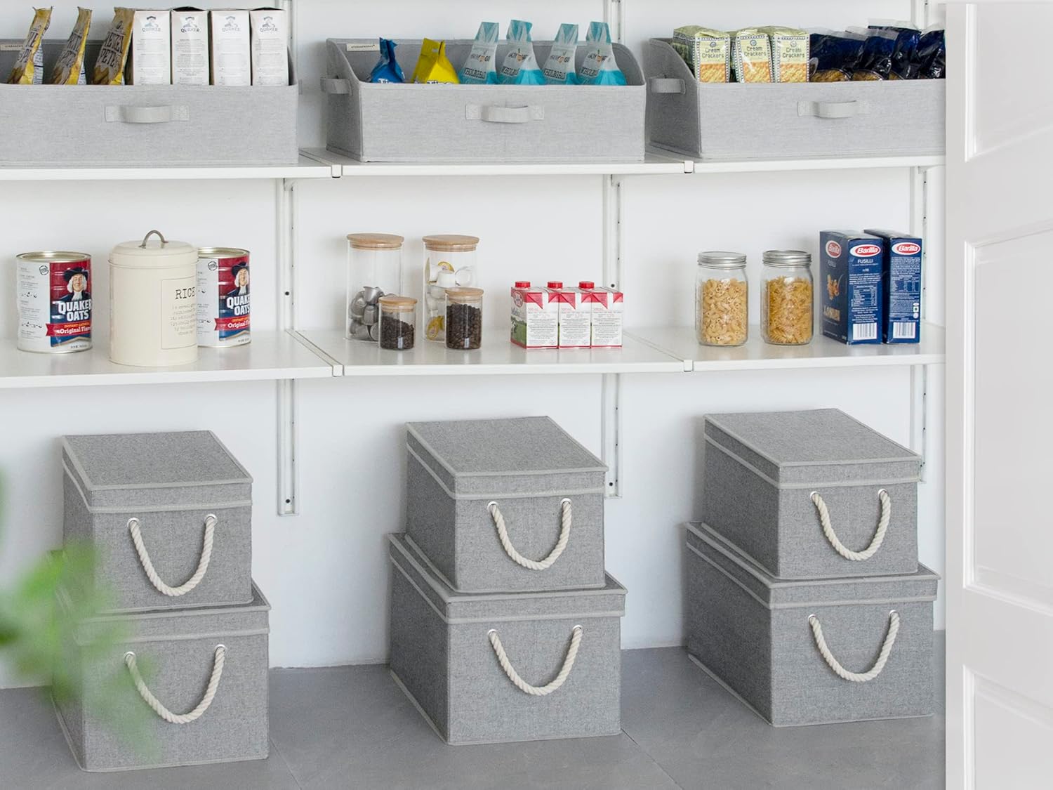 StorageWorks Large Storage Bins with Lids, Decorative Storage Boxes with Lid and Soft Rope Handles, Foldable Storage Baskets for Closet, Shelves, Stackable, Gray, 3-Pack