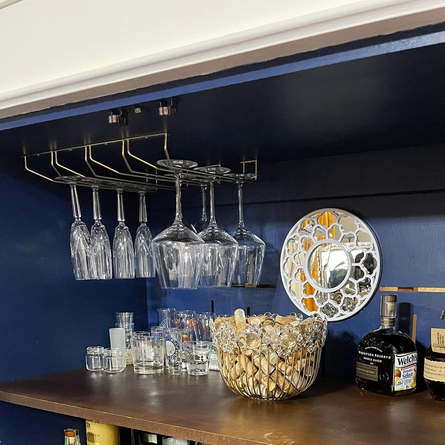 - EASY TO INSTALL: The wine glass holder comes fully assembled but requires installation. Hardware included for easy mounting. Installation is a breeze with the included screws and anchors. Fits under most cabinets. Enjoy the installation!