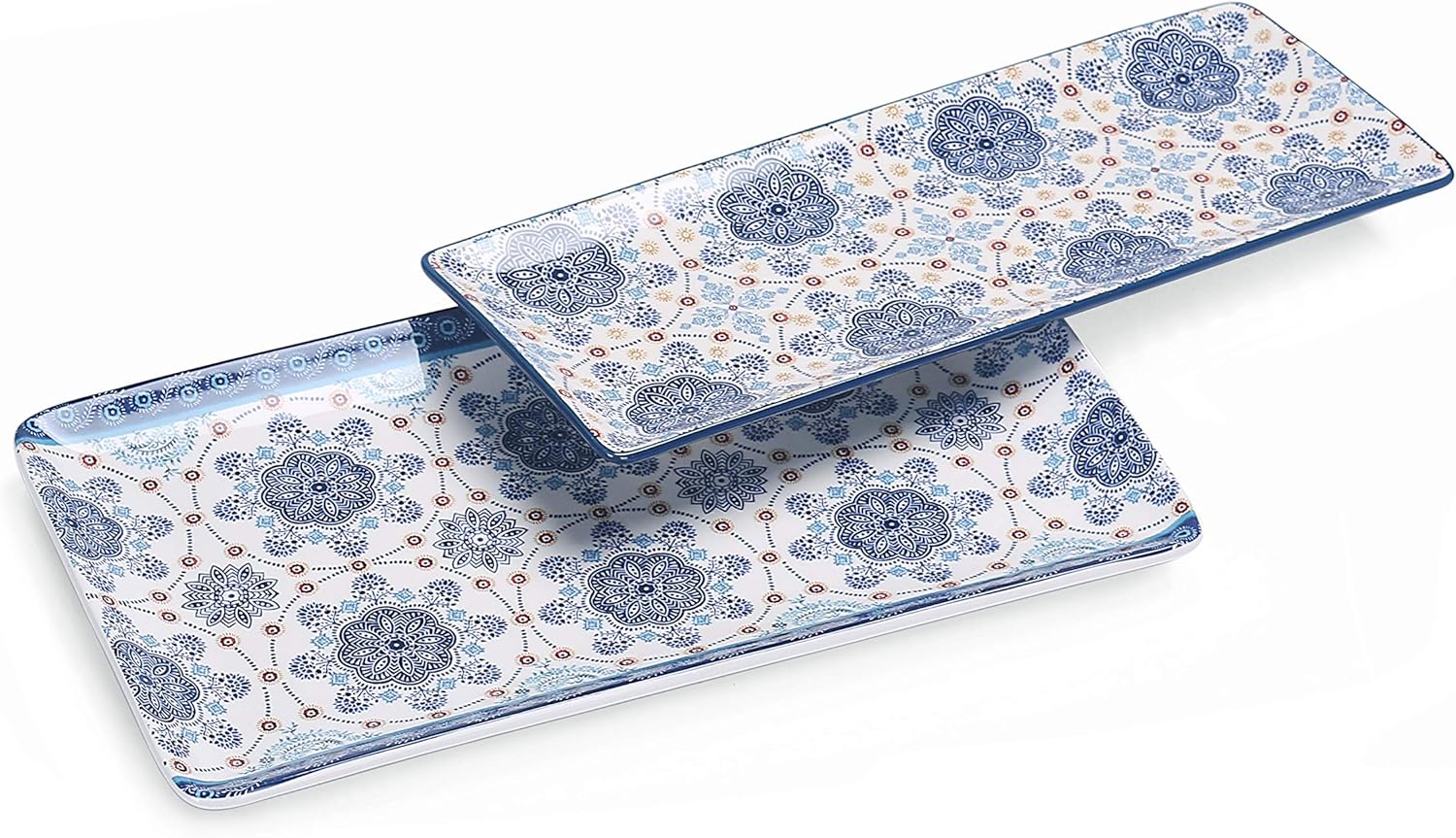 Bico Blue Talavera Ceramic 14 inch Rectangular Serving Platter, Set of 2, for Serving Salad, Pasta, Cheese, Ham, Appetizer, Microwave & Dishwasher Safe