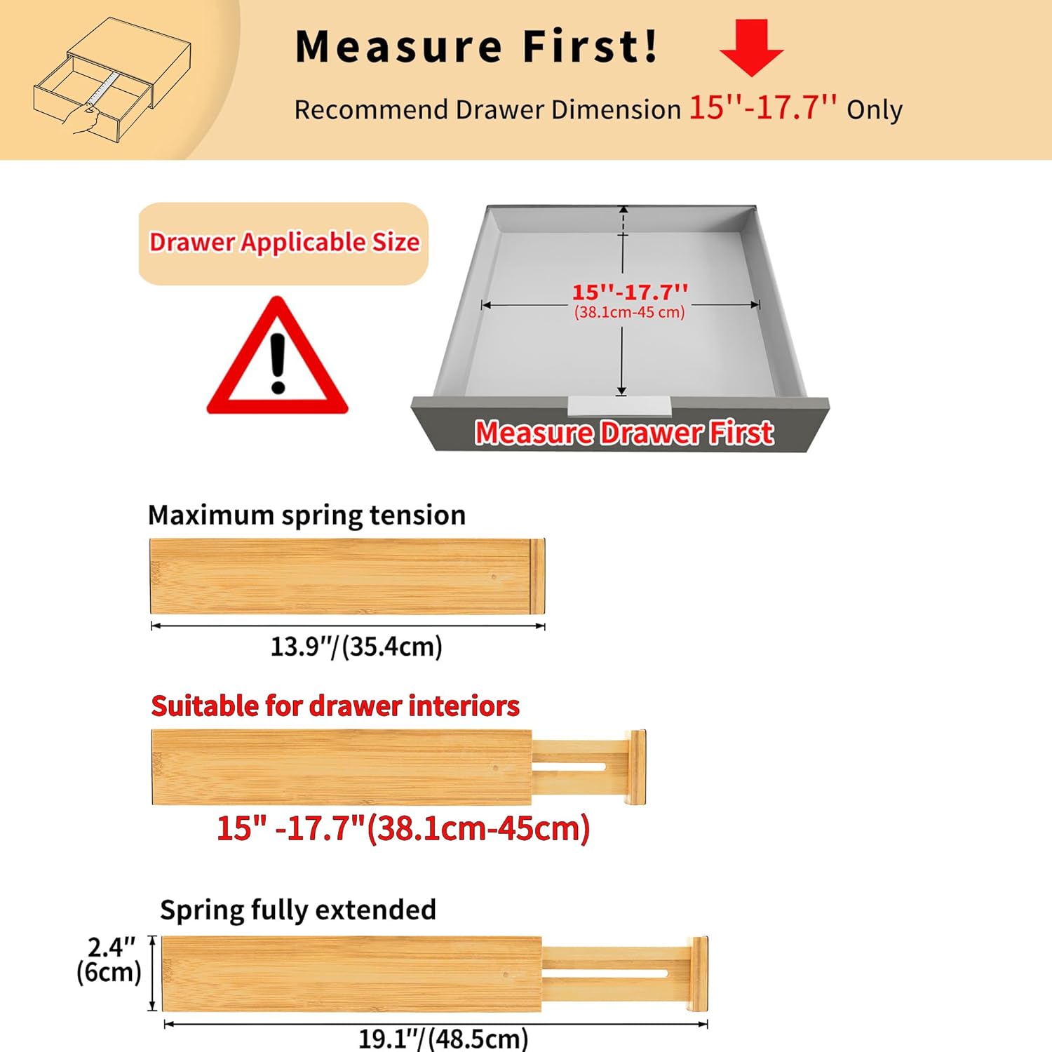 - γCheck Drawer Size Before Purchaseγ **Important**: Fits drawers **15" to 17.7" wide (inner size only)**. If your drawer is **wider than 17.7"**, please opt for our **larger size**. If it's **narrower than 15"**, the divider will be **too tight or not fit properly**. **Always measure before buying!**