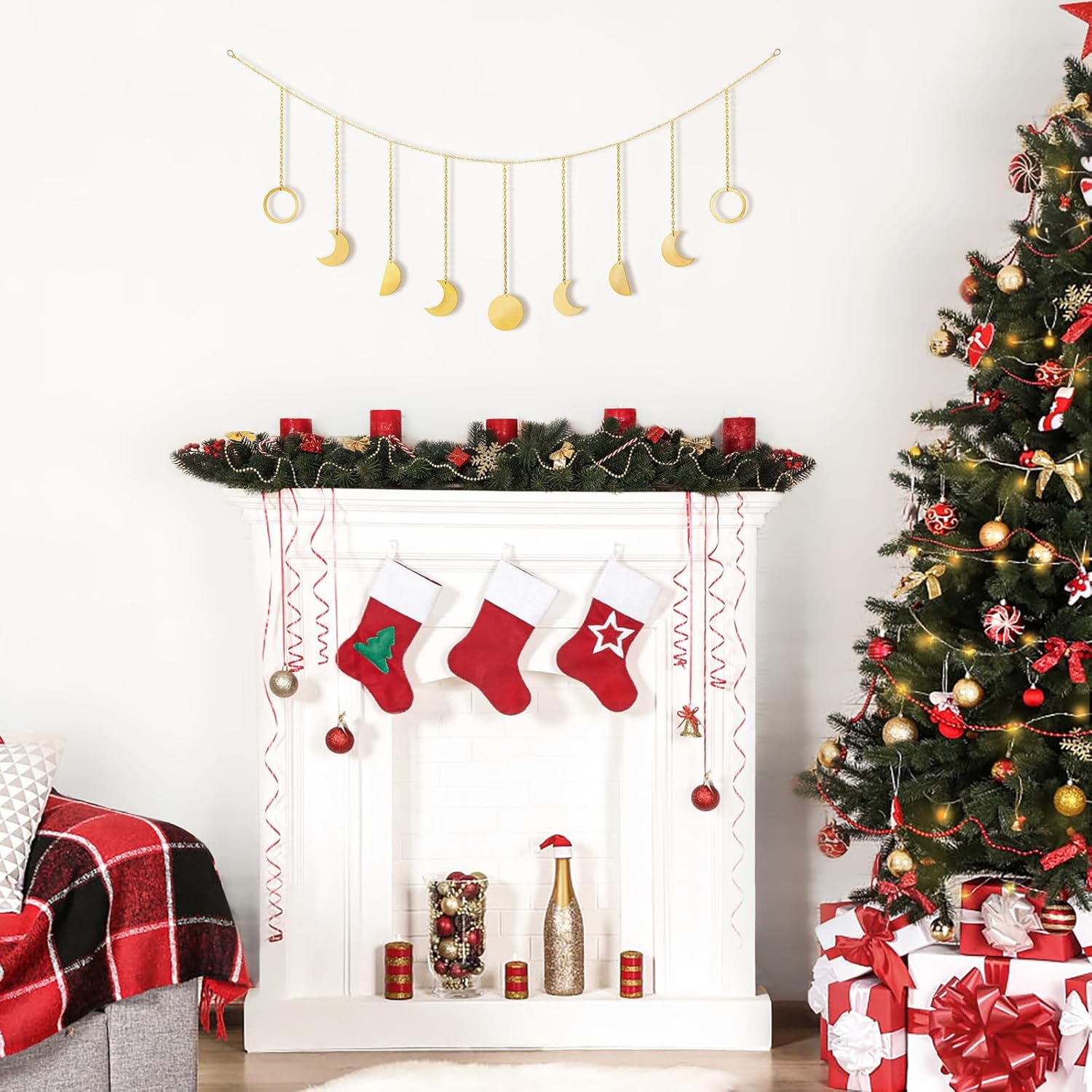 Mkono Moon Phase Wall Hanging Boho Aesthetic Room Decor Metal Moons Garland Hanging Art Bohemian Home Decoration for Girls Room Nursery Bedroom Livingroom Dorm, Ideal, Gold, 50"