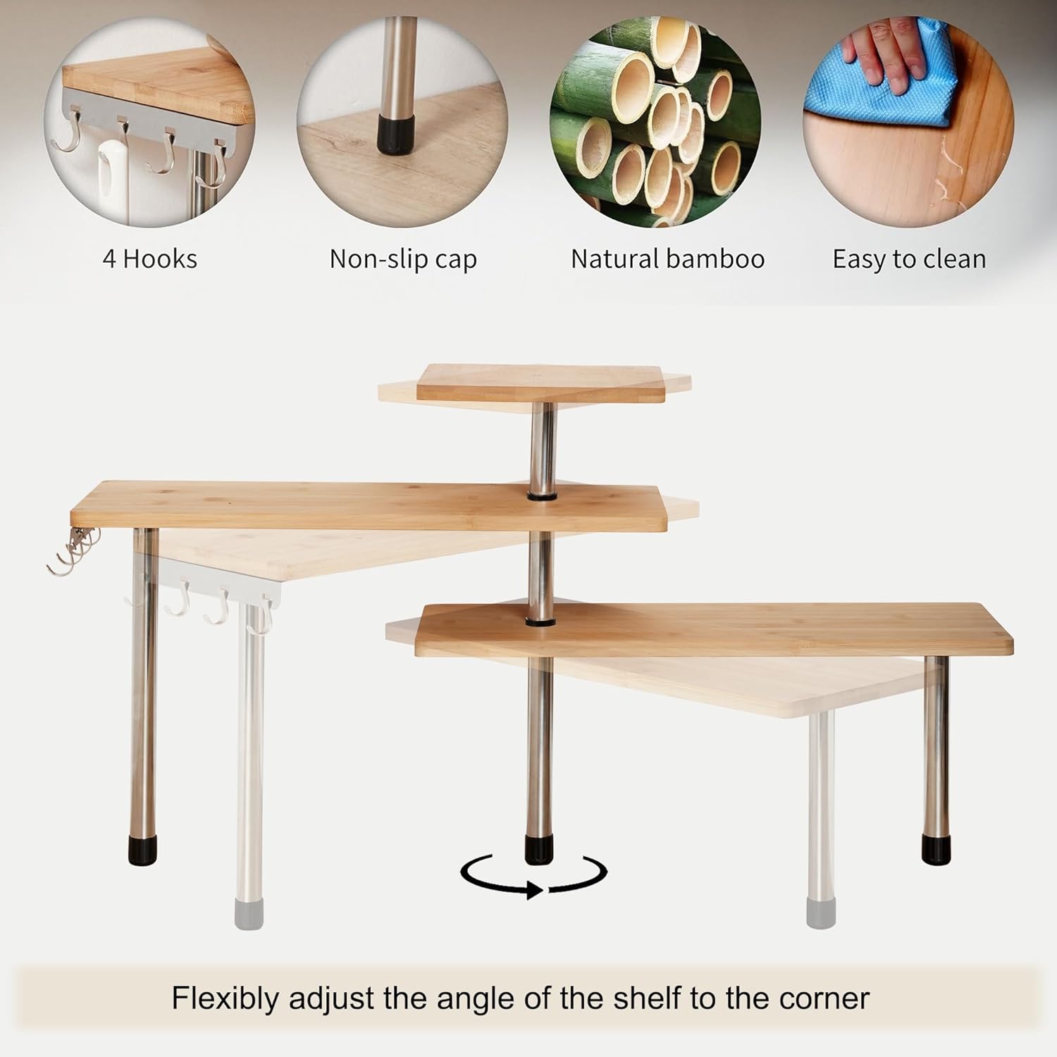 HYNAWIN Corner Shelf, 3 Tier Bamboo & Metal Storage Spice Rack-Desk, Space Saving Bookshelf with Hooks, Adjustable Display Shelf for Creative Home Décor Kitchen, Bedroom, Office (21CO)