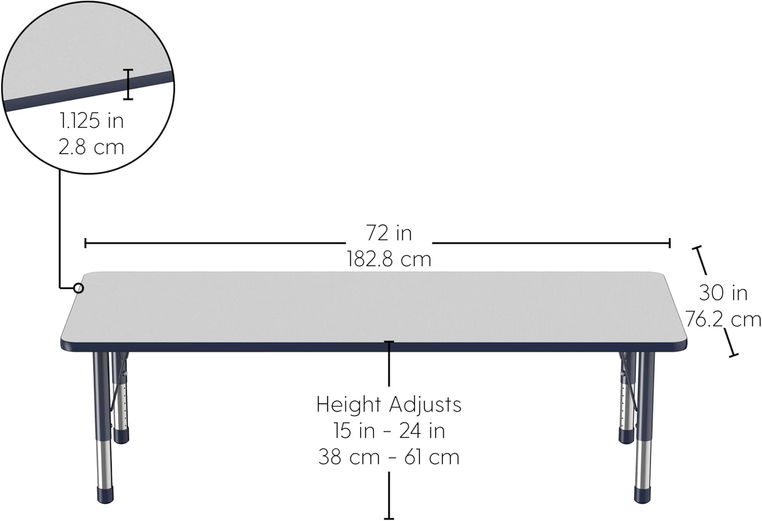 FDP Rectangle Activity School and Classroom Kids Table (30 x 72 inch), Chunky Toddler Leg, Adjustable Height 15-24 inches - Gray Top and Navy Edge