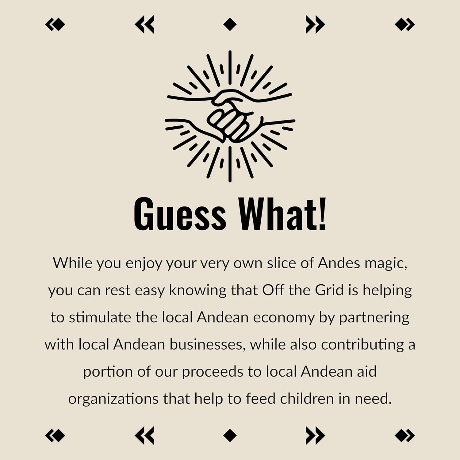 - SOCIALLY RESPONSIBLE: While you enjoy your very own slice of Indian Andes magic, you can rest easy knowing that Off the Grid is helping to stimulate the local Andean economy by partnering with native Andean businesses, while also contributing a portion of our proceeds to local Andean aid organizations that help to feed children in need.