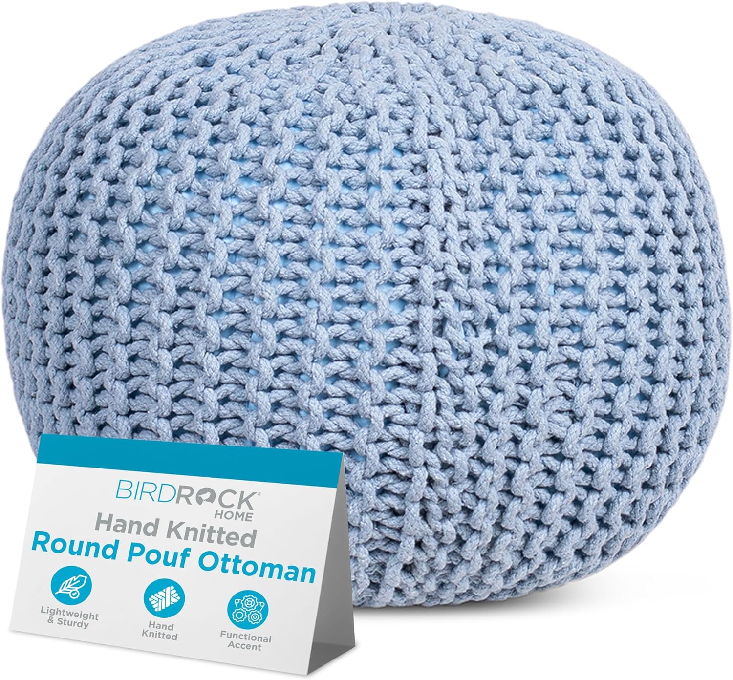BIRDROCK HOME Round Pouf Ottoman | Cotton Braided Foot Stool with Bean Bag Filling | Boho Foot Rest for Living Room & Bedroom | Compact & Comfortable Seating, Lightweight & Soft | Soft Blue