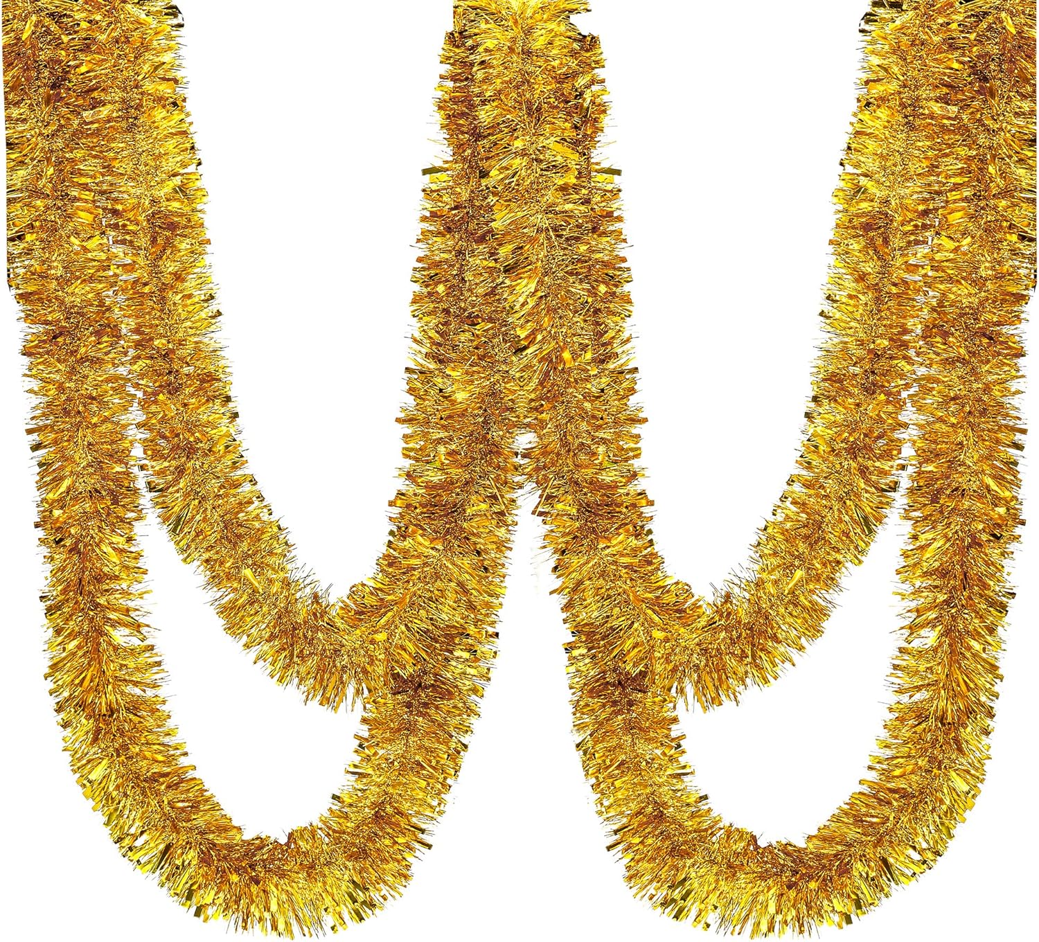 - The gold tinsel twist garland measures 4 inch diameter by 25 foot long roll.
