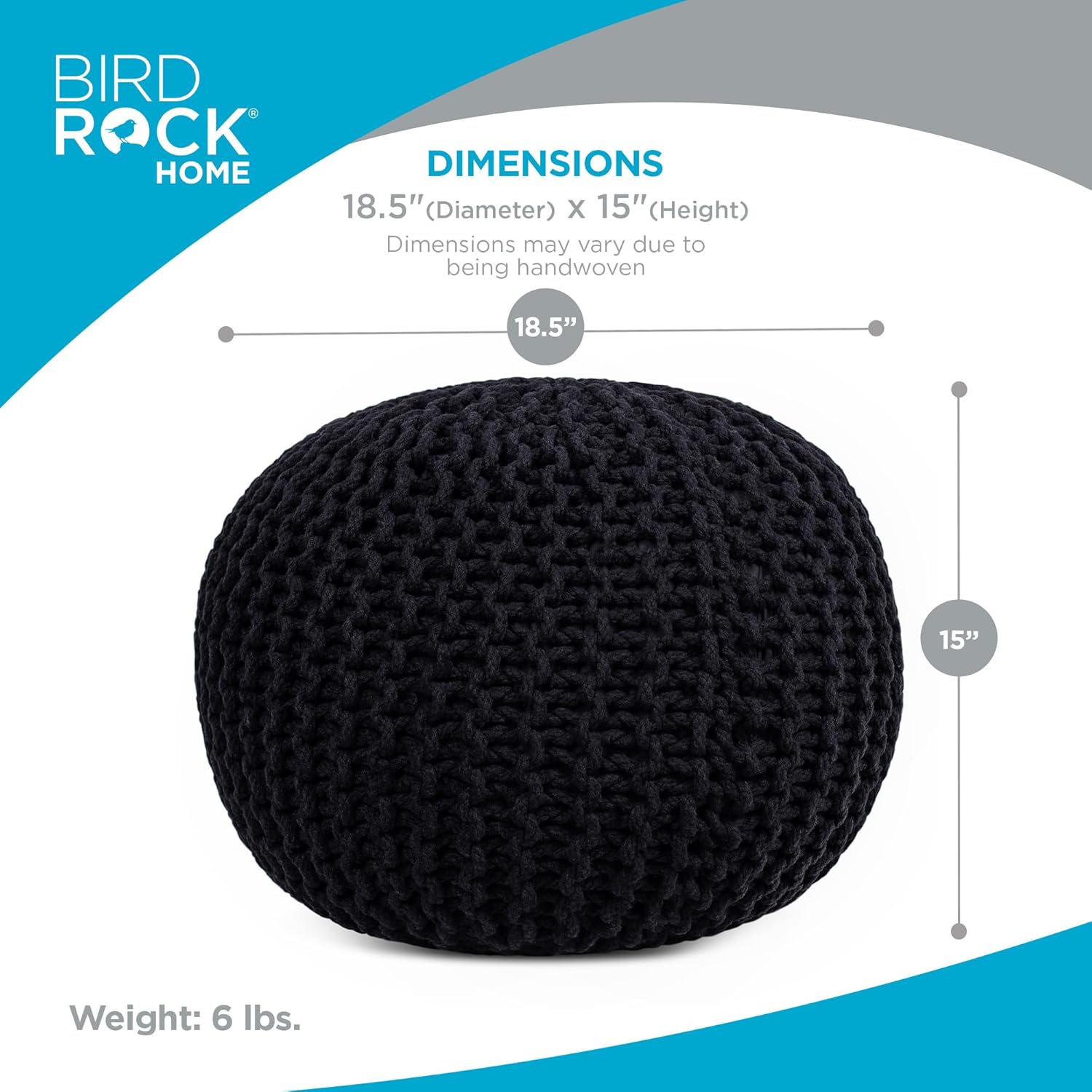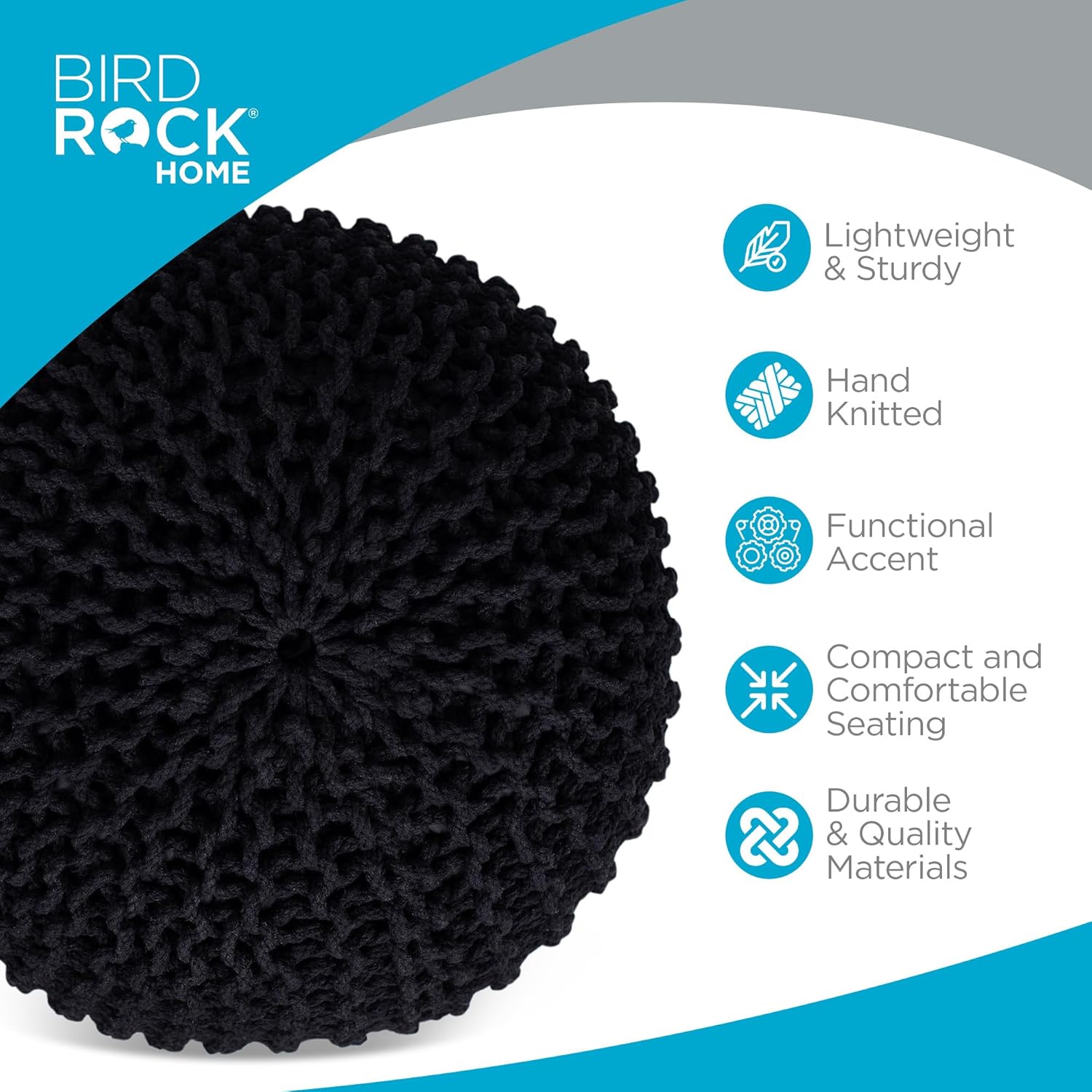 BIRDROCK HOME Round Pouf Ottoman | Cotton Braided Foot Stool with Bean Bag Filling | Boho Foot Rest for Living Room & Bedroom | Compact & Comfortable Seating, Lightweight & Soft | Black