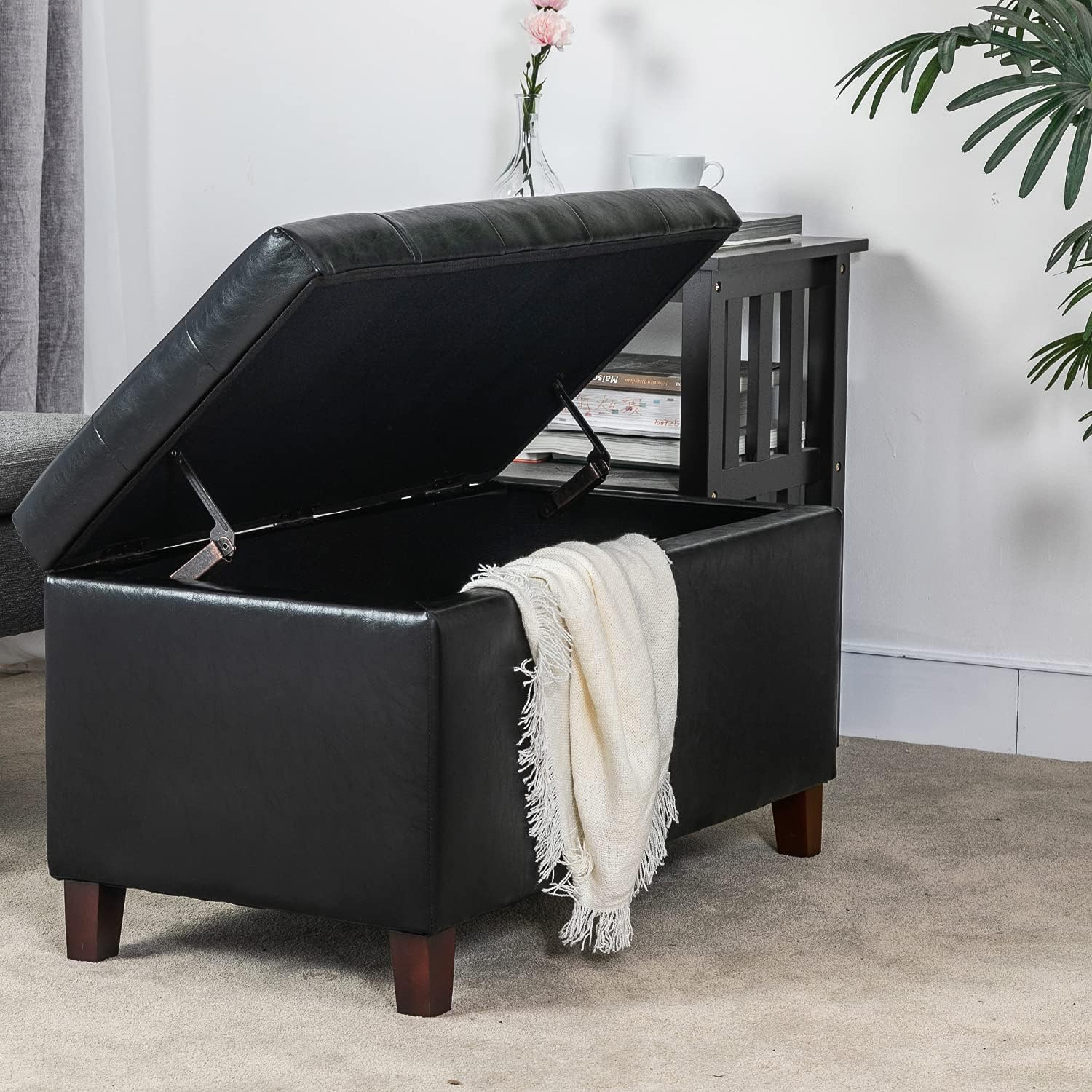 Asense Storage Ottoman Bench, Faux Leather Upholstered End of Bed Bench with Safety Hinge Wooden Legs, for Entryway Bedroom (Black, 33.3")