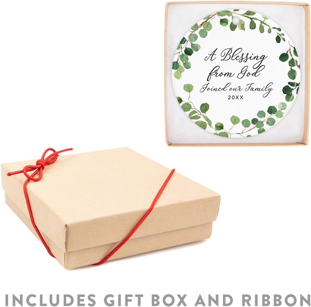 Andaz Press Custom Year Round Ceramic Porcelain Christmas Tree Ornament Keepsake Collectible Gift, A Blessing from God Adopted 2025, Farmhouse Eucalyptus Wreath, 1-Pack