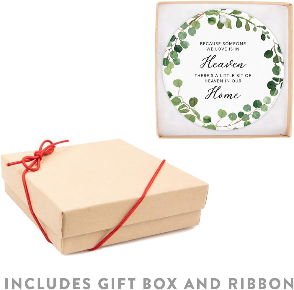Andaz Press Round Ceramic Porcelain Christmas Tree Ornament Keepsake Memorial Bereavement, Because Someone We Love is in Heaven, There's Heaven in Home, Farmhouse Eucalyptus Wreath, 1-Pack