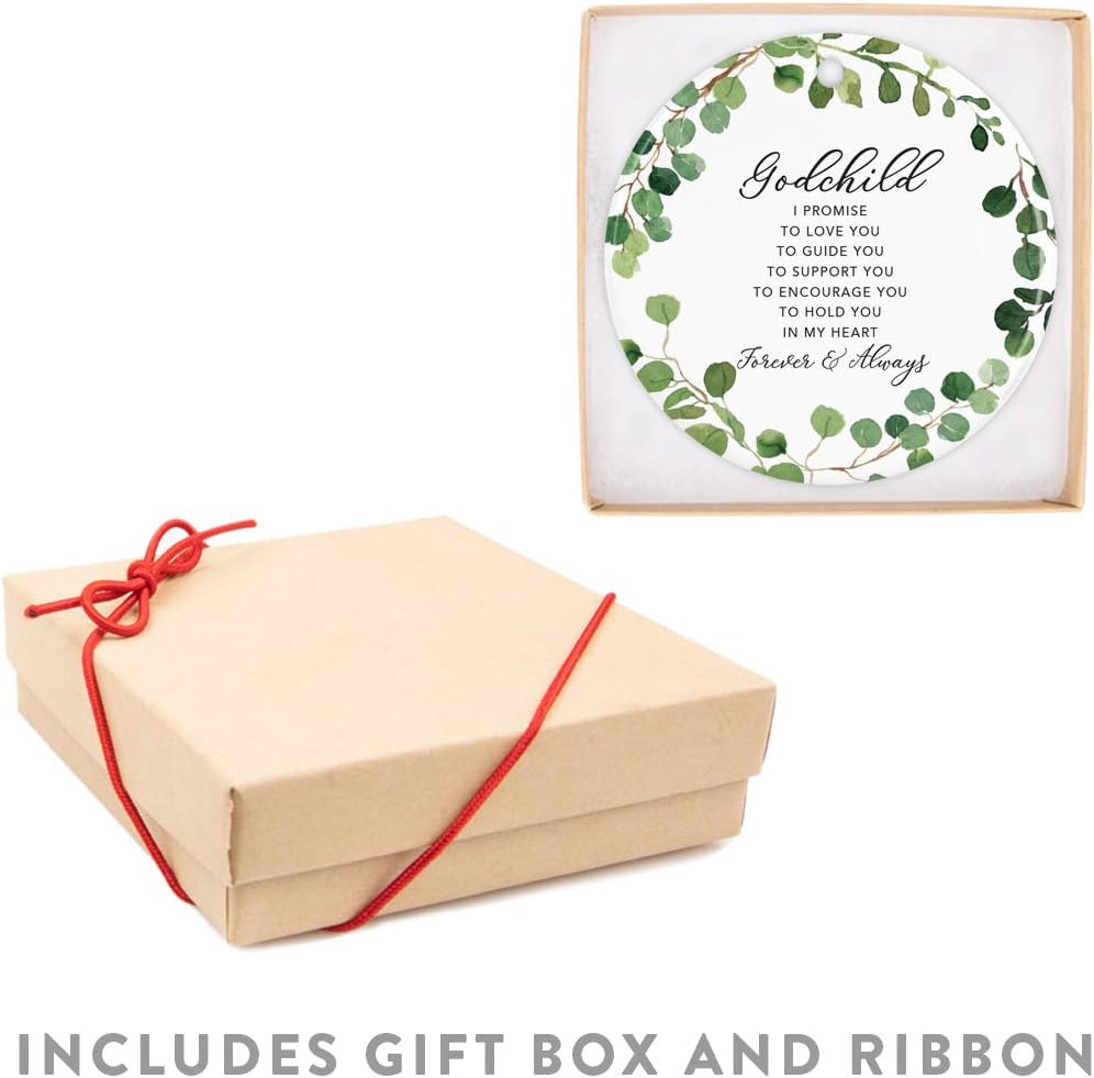 Andaz Press Round Ceramic Porcelain Christmas Tree Ornament Keepsake Collectible Gift, Godchild I Promise to Love You, Farmhouse Eucalyptus Wreath, 1-PackBaby Shower Baptism Christening Gift Ideas