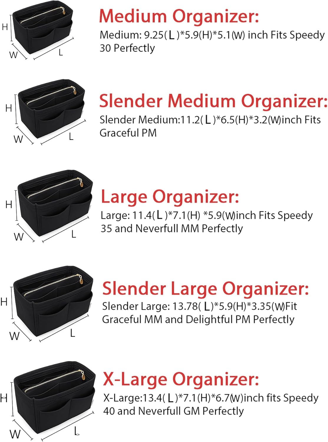 • SIZE OF BAG ORGANIZER: Medium: 9.25(L)*5.9(H)*5.1(W) inch Fits Speedy 30 Perfectly. Slender Medium: 11.2(L)*6.5(H)*3.2(W)inch Fits Graceful PM. Large: 11.4(L)*7.1(H) *5.9(W)inch Fits Speedy 35 and Neverfull MM Perfectly. Slender Large: 13.78(L)*5.9(H)*3.35(W)Fit Graceful MM and Delightful PM Perfectly. X-Large:13.4(L)*7.1(H)*6.7(W)inch fits Speedy 40 and Neverfull GM Perfectly. Portable and Compact Purse Perfectly For any Brand.L*H*W means (Length*Height*Width)