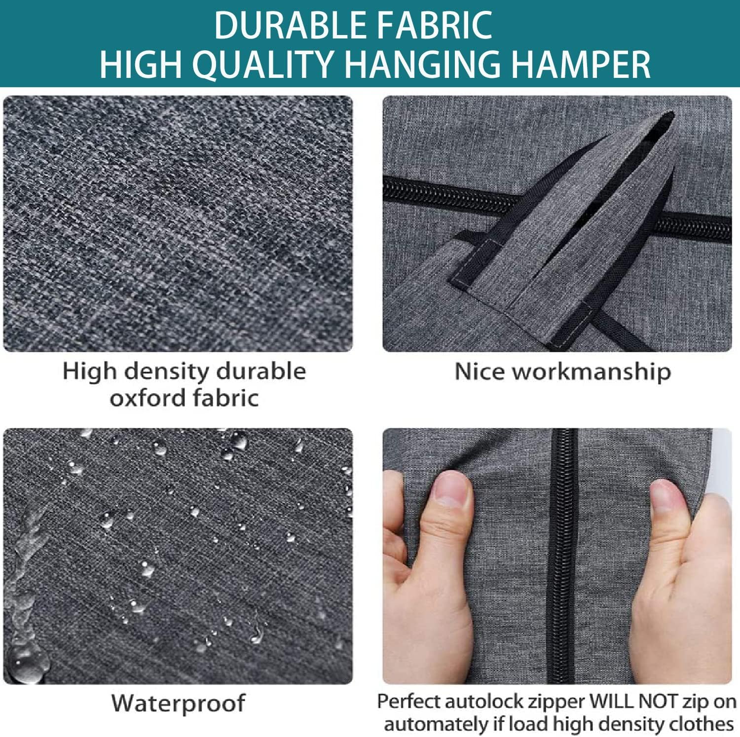 - γDURABLE FABRIC AND MATERIALSγThis over the door hamper bag is made of durable 600D tear-resistant oxford fabric,waterproof and machine washable.The reinforced sewing thread for whole laundry bag,plus the double lock stitches on zipper that help extend the service life of this hamper, it can be used even more than 5-8 years.Very good value for money.