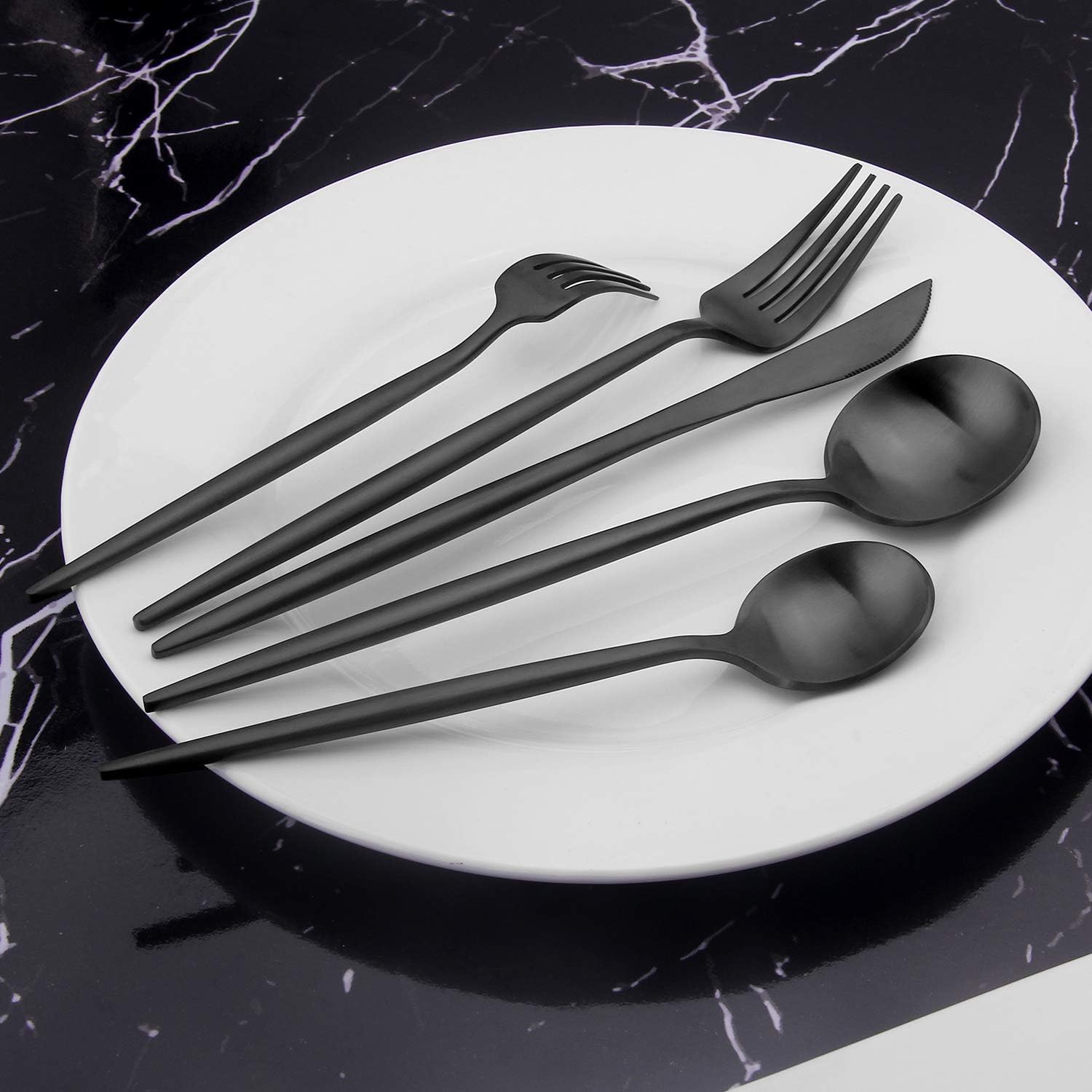 - ★ Modern silverware set--This eating utensils sets have the slim profiles and pointed stems, is a sophisticated take on minimalist design. The black kitchen utensils set includes everything you need for a formal full-course meal. They can match your modern dinnerware set and dish set perfectly.