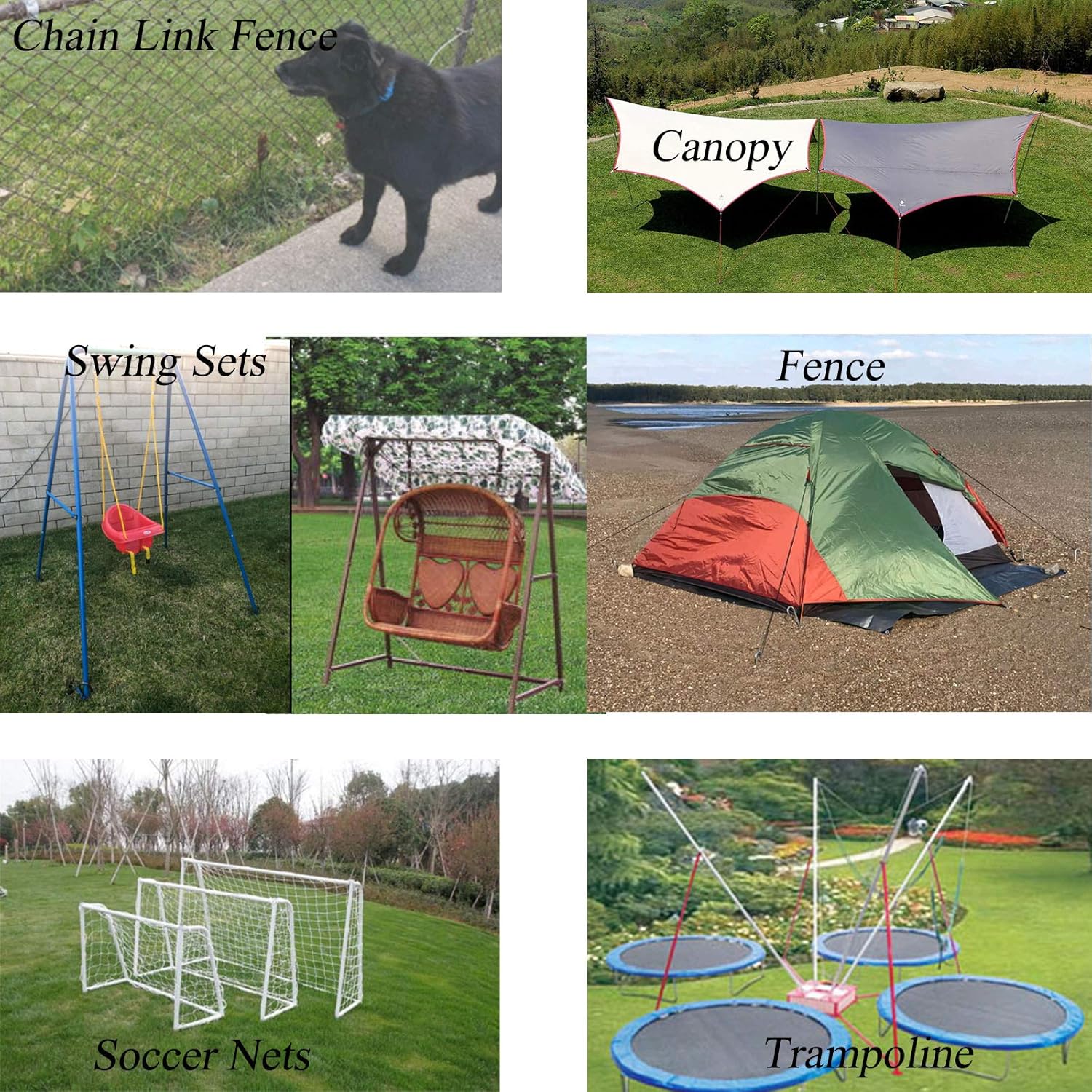 - MULTIPLE USES - Use them as chain link fence stakes. Help you to hold down the swing sets, trampoline, soccer goals, camping tents,hammock slides, fences, yard decorations, huge Christmas Outdoor Decoration, nets, large canopy, inflatable outdoor yard decorations, irrigation, tarps, soccer nets, landscape edging, garden trellises, gazebos and more.