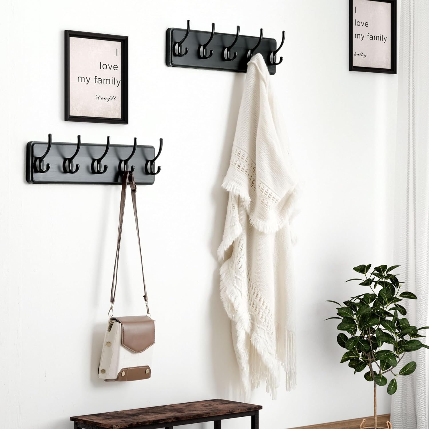 Dseap Wall Mounted Coat Rack: Patented, Heavy-Duty, 17.4" Long 5-Double-Hooks Wooden Hanger Rail for Winter Coats, Hats, Jackets, Clothing - Black, Pack of 2