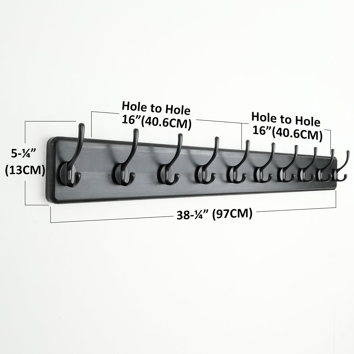 - Sizes(inch): 38-1/4 x 5-1/4 x 2-3/4; Including 2 x wooden coat racks wall mount with 10 dual hooks, mounting hardware, black color.