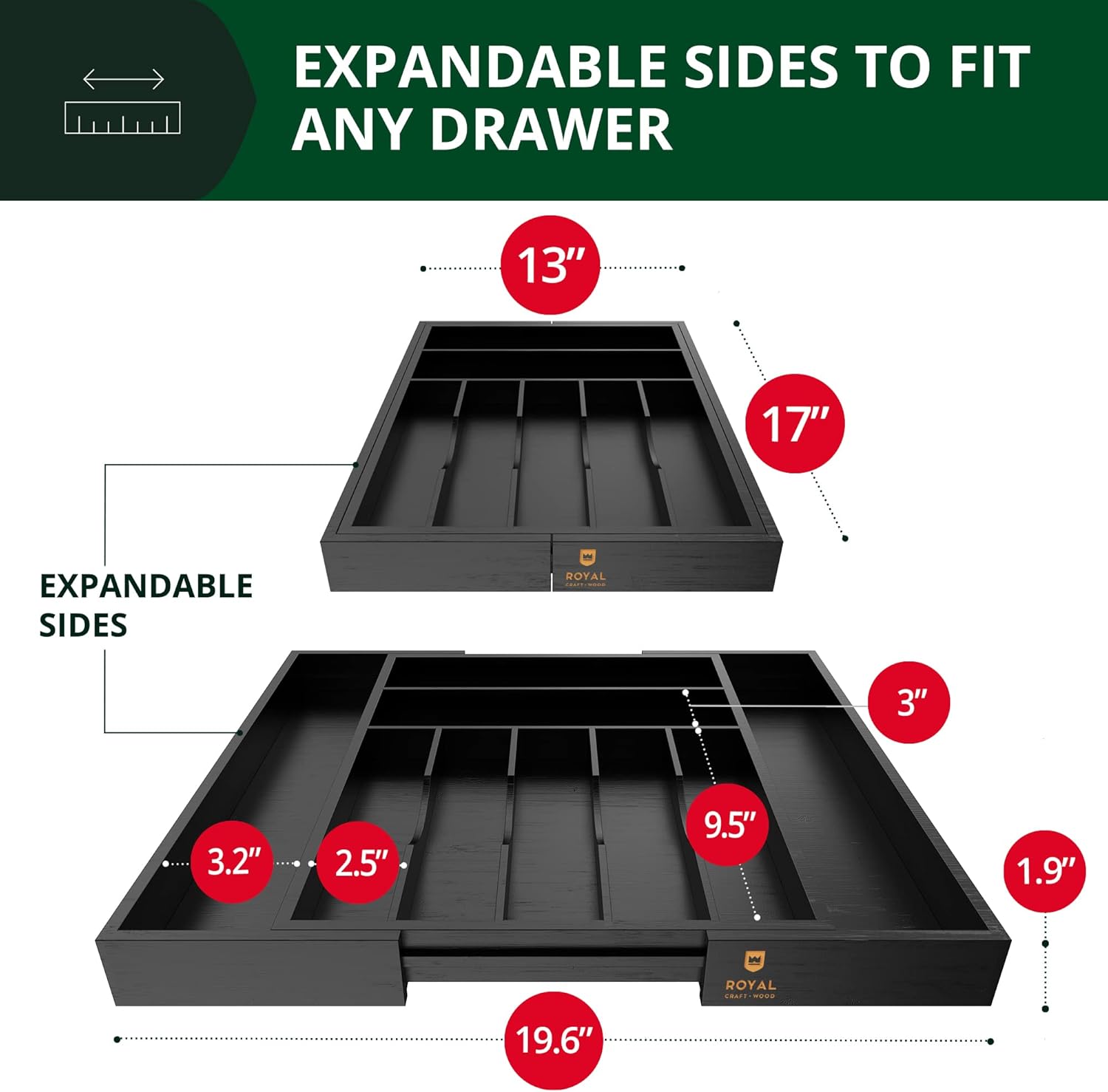 - Black utensil holder for the drawer; Royal Craft Wood bamboo expandable drawer organizer for utensils holder is perfect to keep everything in hand reach; Forget about the messy drawers now with a Royal Craft Wood; Organize your kitchen utensils, office stuff, or jewelry with a bamboo silverware drawer organizer
