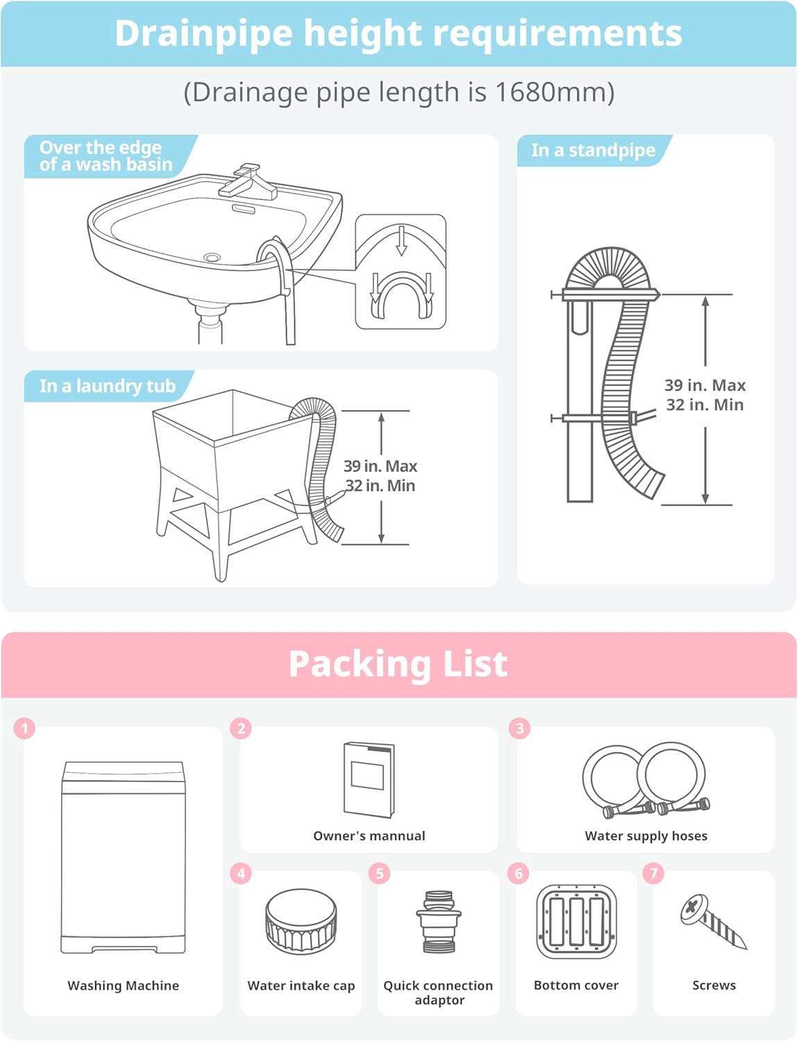 - Space saving: - With only 20.7inch in width, 20.3inch in-depth, and 36.6inch in height, this compact washer is able to be stored easily. Fits in your room/RV/dormitory nicely. The large capacity of 1.6cu.ft top load washer can hold 11lbs of cloth. It equips with a stainless steel inner tub which lasts longer.