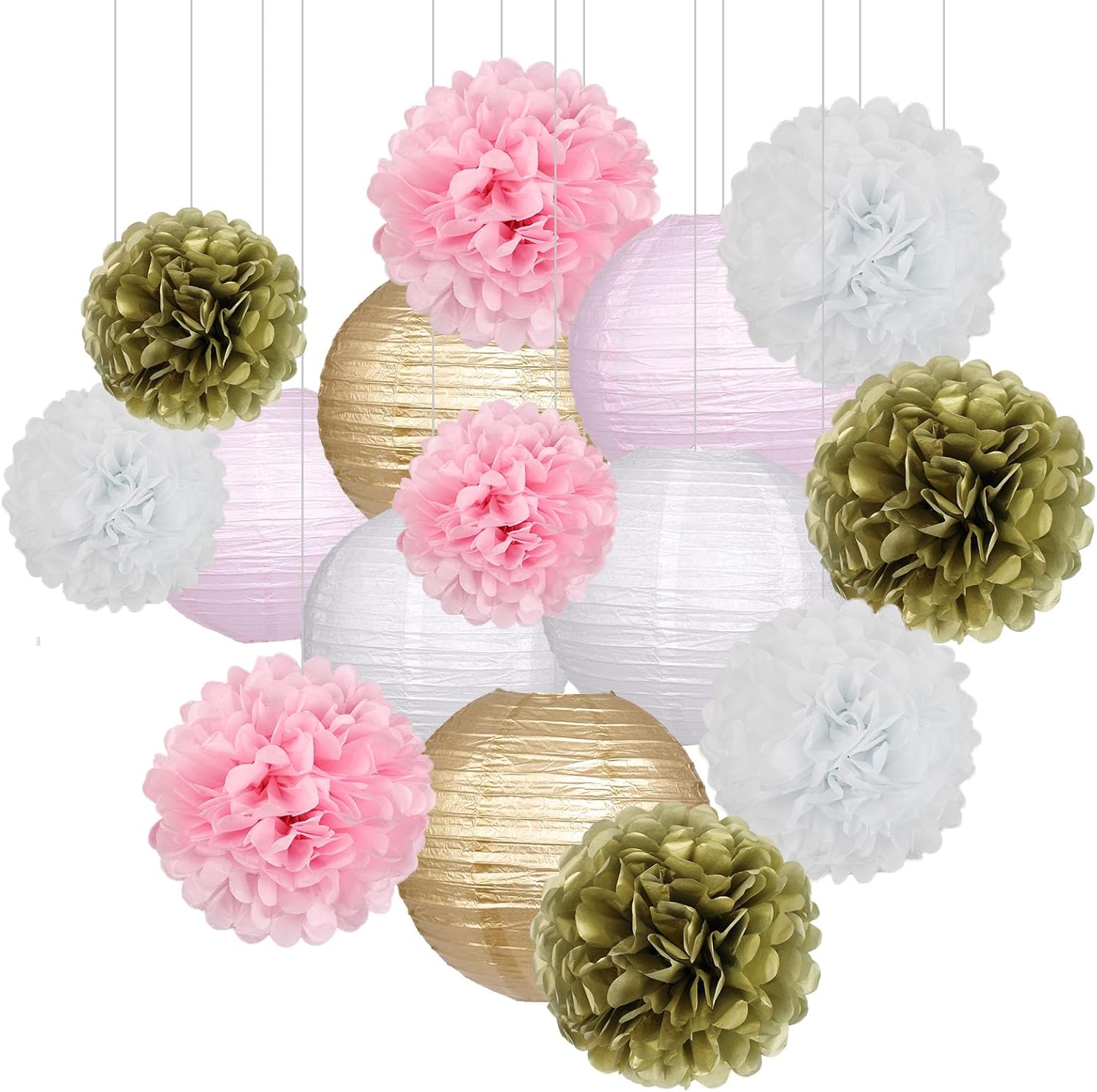 - PINK AND GOLD PARTY DECORATION SET INCLUDES: 1pc 8inch+1pc 10inch light pink paper lanterns, 1pc 8inch+1pc 10inch gold paper lanterns, 1pc 8inch+1pc 10inch white paper lanterns, 1pc 8inch+2pc 10inch light pink tissue pom poms, 1pc 8inch+2pc 10inch gold tissue pom poms, 1pc 8inch+2pc 10inch white tissue pom poms. Pink, white and gold paper lanterns and paper pom pom decorations will add a festive touch to any themed birthday party.