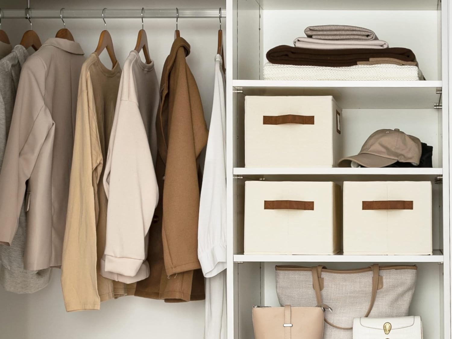 StorageWorks Storage Baskets for Shelves, Foldable Fabric Closet Storage Bins with PU Handles, Fabric Storage Bins Clothes Organizer, Ivory White, 3-Pack, Large