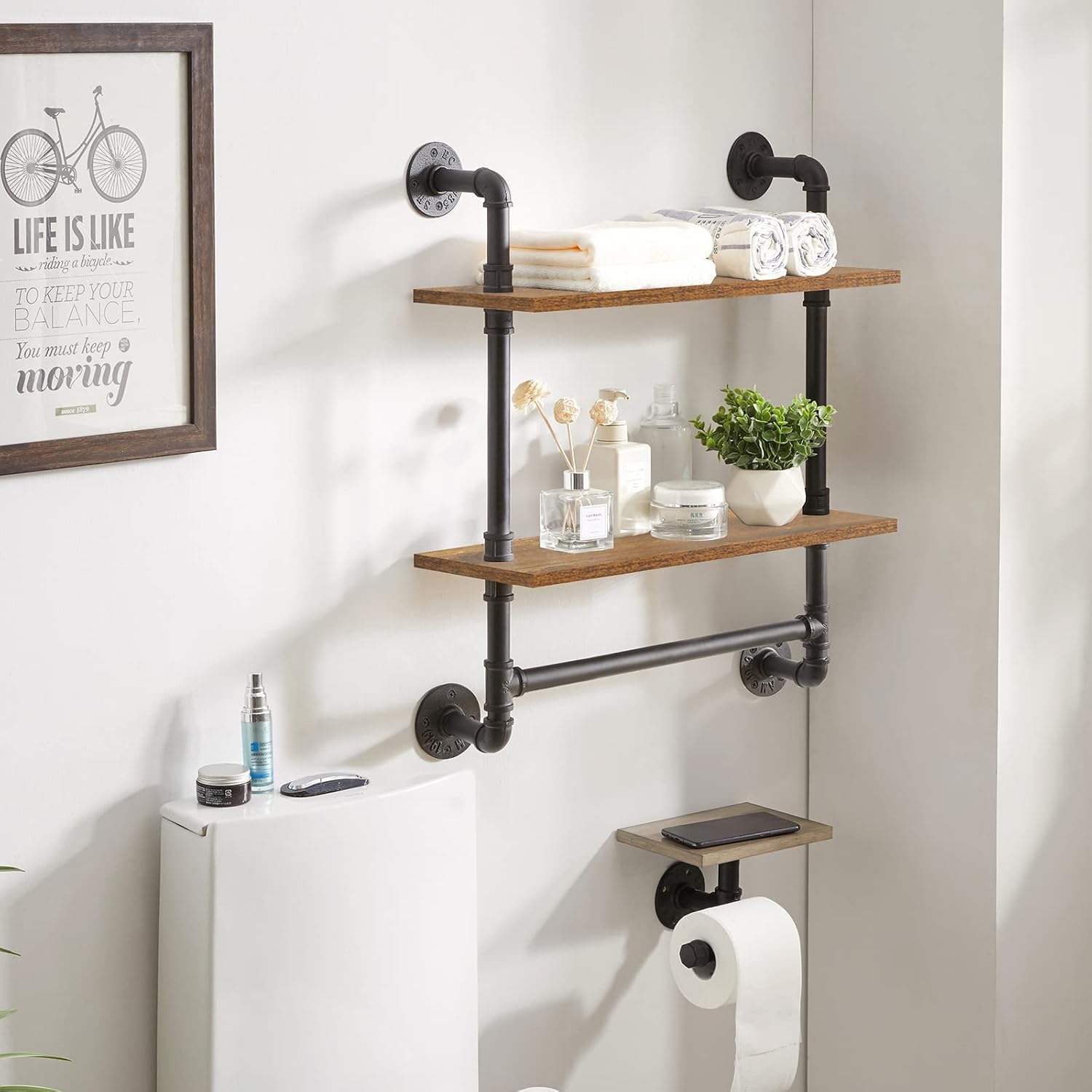 - Artist of the Wall: The rustic panels and sturdy plumbing make this floating rack a stunning sight. The two-layer shelves and towel bar at the bottom keep everything you need handy. Its versatile style suits most home decor.