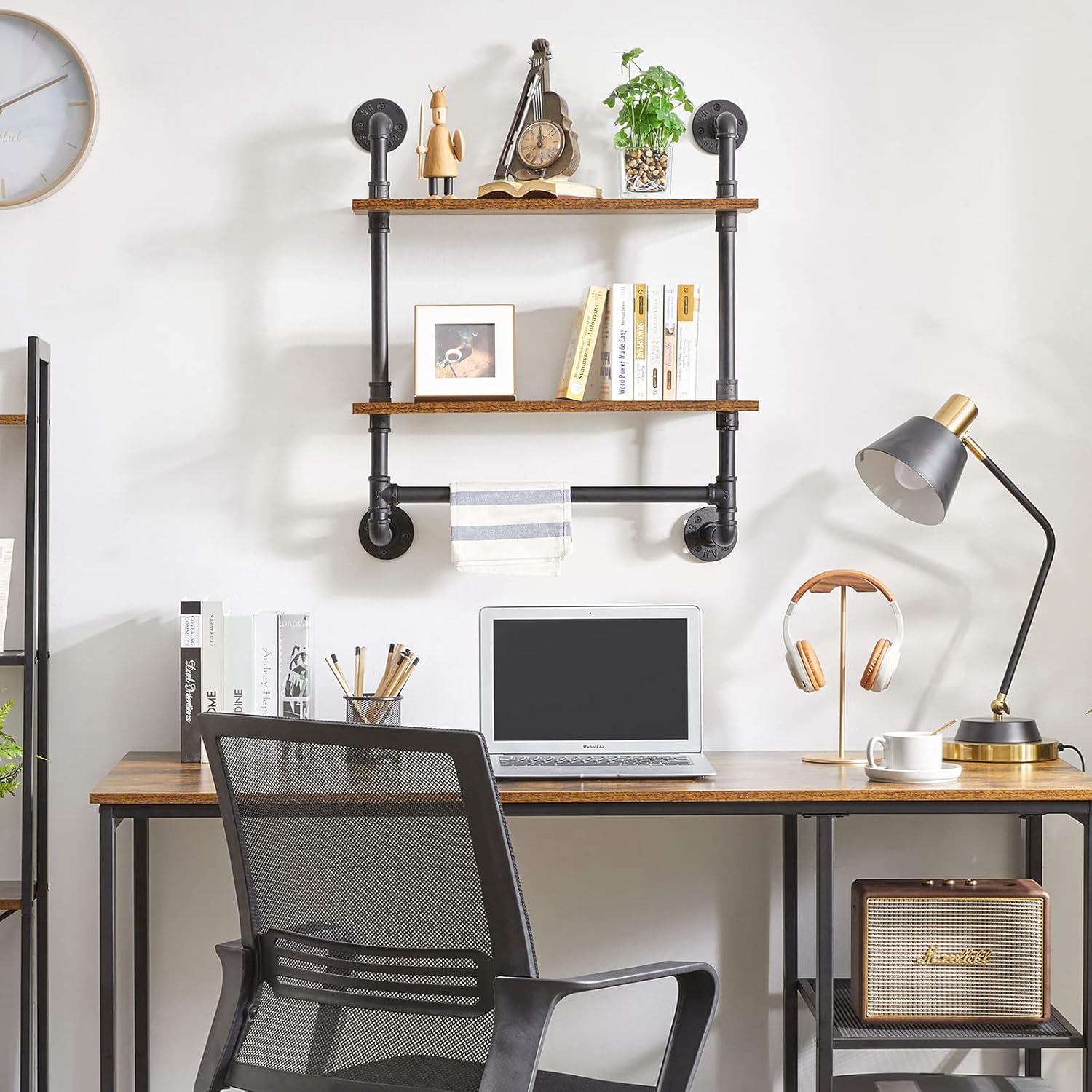IBUYKE Pipe Floating Shelves,Rustic Iron 28.5 inches Industrial Pipe Shelf,2-Tier Wall Shelf with Towel Bar,Wall Mount Bookshelf for Bedroom,Kitchen,Living Room,Bathroom URF-TM014
