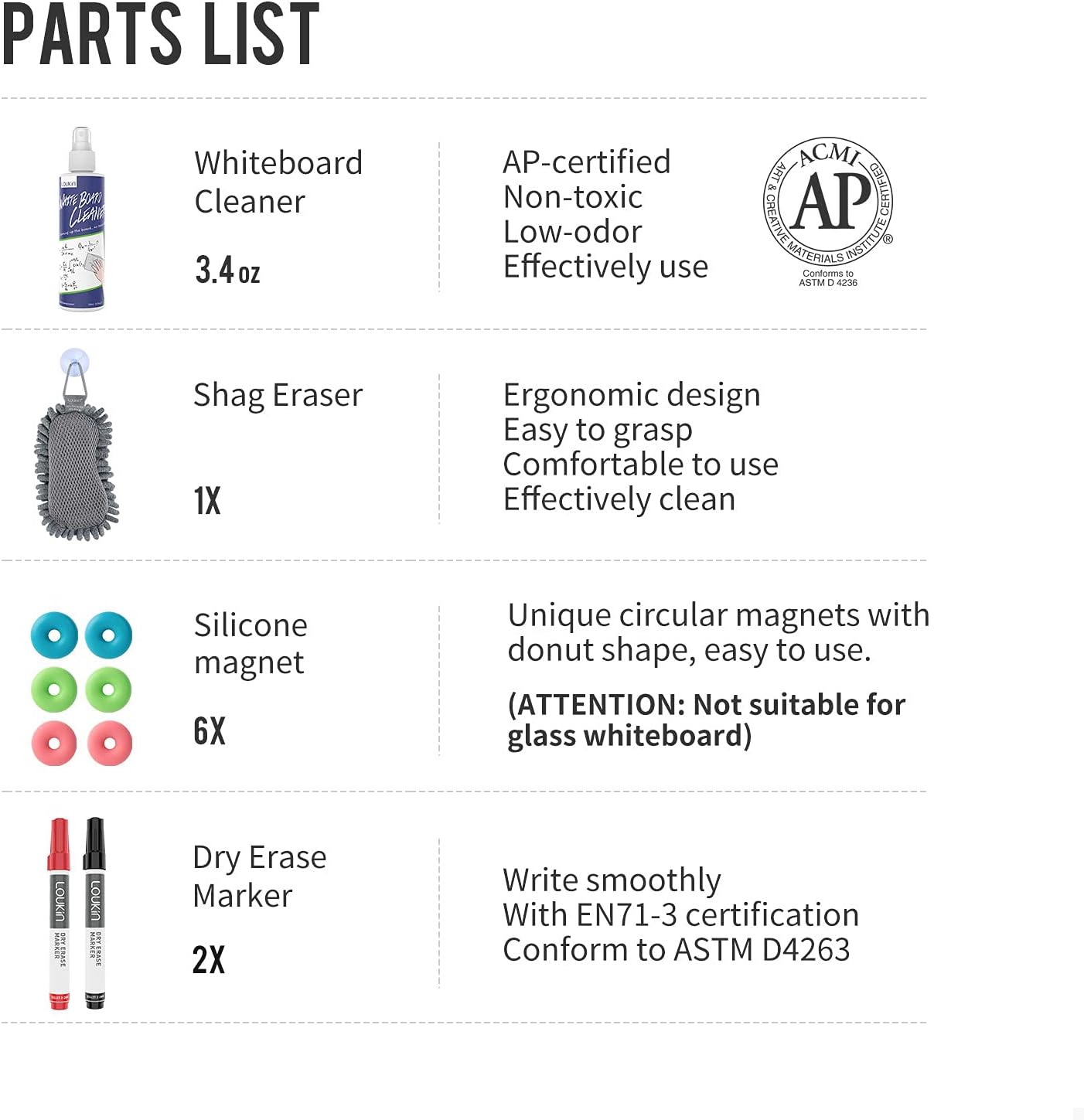 - CONTAINS: 1 x marker holder (8.4 x 3.5 x 2.7 in) ; 1 x shag eraser; 2 x dry erase markers with En713 certification; 1 x 3.4 fl oz cleaner with AP certification; 6 x strong magnet; 2 x long-lasting adhesive.