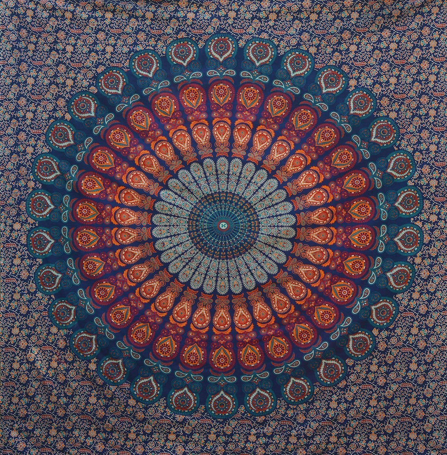 Bless International Handmade Indian hippie Bohemian Psychedelic Peacock Mandala Wall hanging College Dorm Beach Throws Table Cloth Bedding Tapestry (Golden Blue, Poster(30x40Inches)(76x101cms))