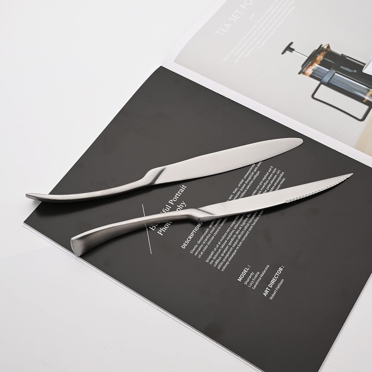 Luxury 304 Stainless Steel Matte Silver Cutlery Flatware Set - Utensil Set Steak Spoons and Forks Knife Silverware Set,Service for 4 (24-Piece)