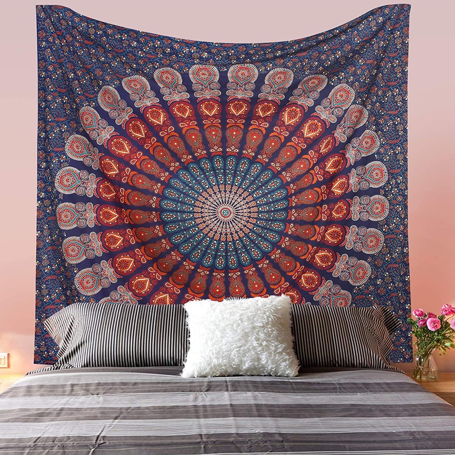 Bless International Handmade Indian hippie Bohemian Psychedelic Peacock Mandala Wall hanging College Dorm Beach Throws Table Cloth Bedding Tapestry (Golden Blue White, Poster(30x40Inches)(76x101cms))