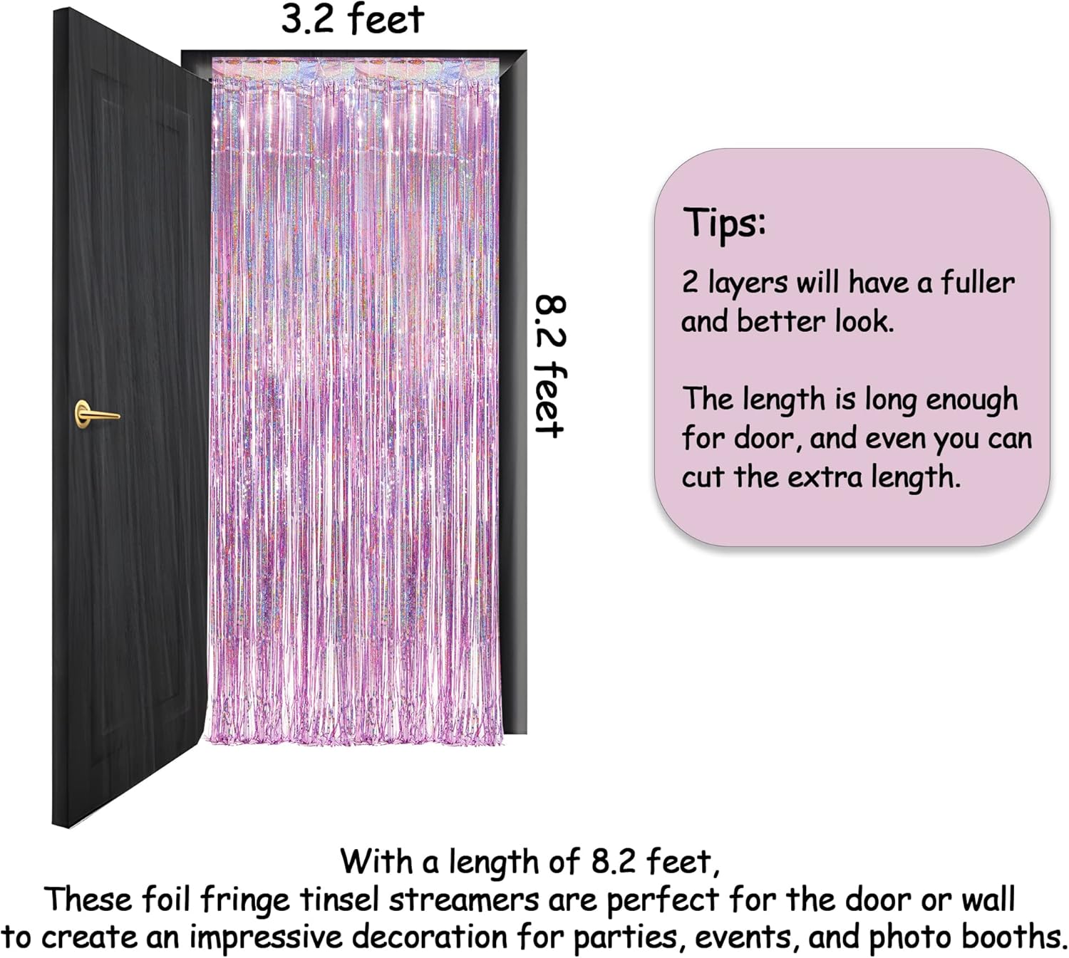 - Pack of 2, 3.2 ft x 8.2 ft for each. With a length of 8.2 feet, GREATRIL foil fringe tinsel backdrops are used for the wall to create an impressive decoration for parties, events, and photo booths.
