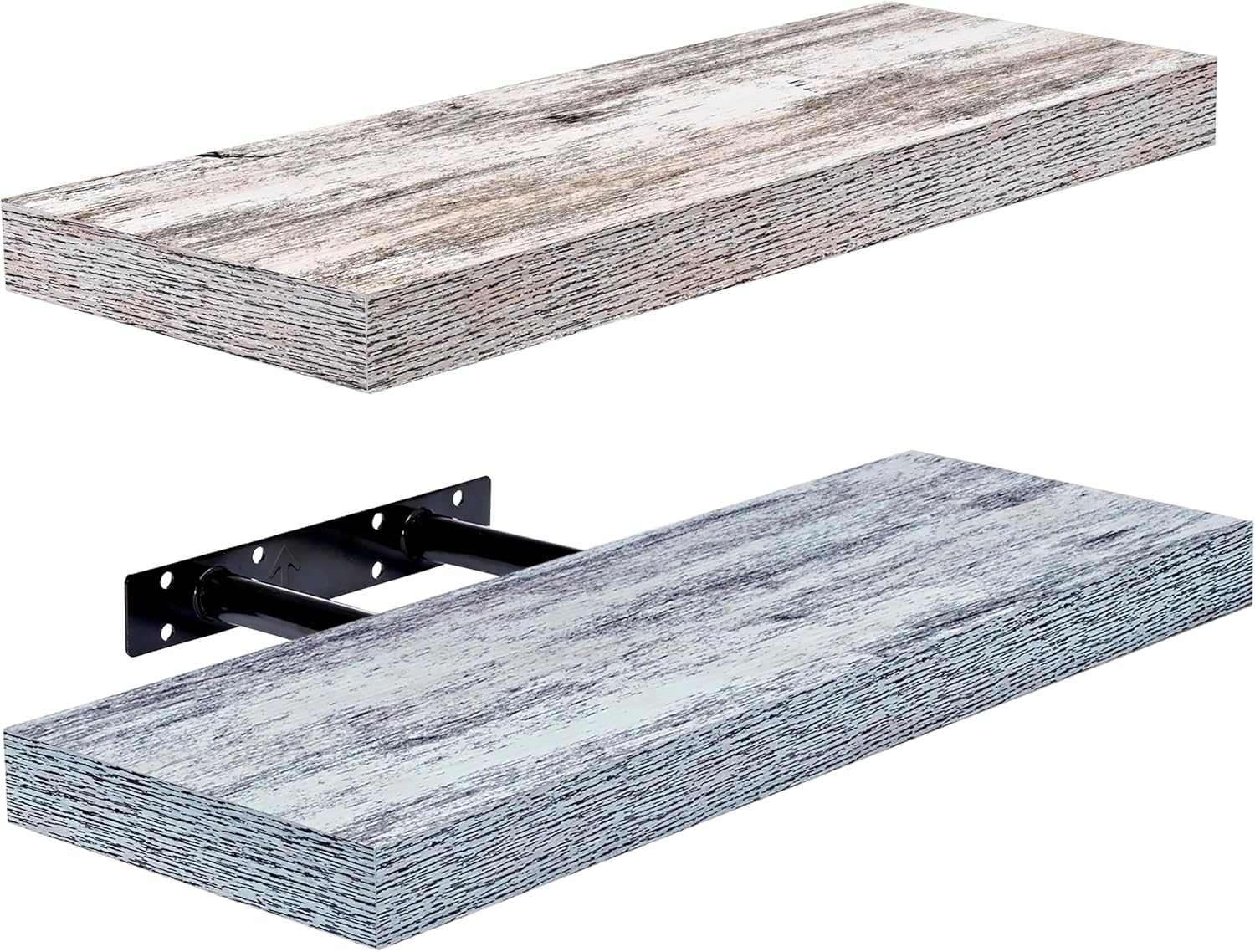 - Easy Installation: Wood Wall Mounted Shelves with Invisible Brackets, Mounting hardware INCLUDED, the Hanging shelves are made of beautiful MDF with PVC + Bracket - Sturdy enough to arrange and display your favorite small objects - Attaches firmly to the wall without visible support - Minor assembly required - Supports up to 22 pounds per shelf - Measures approximately 16.25 inch L x 5.50 inch W - Each display shelf 1.5 inch thick