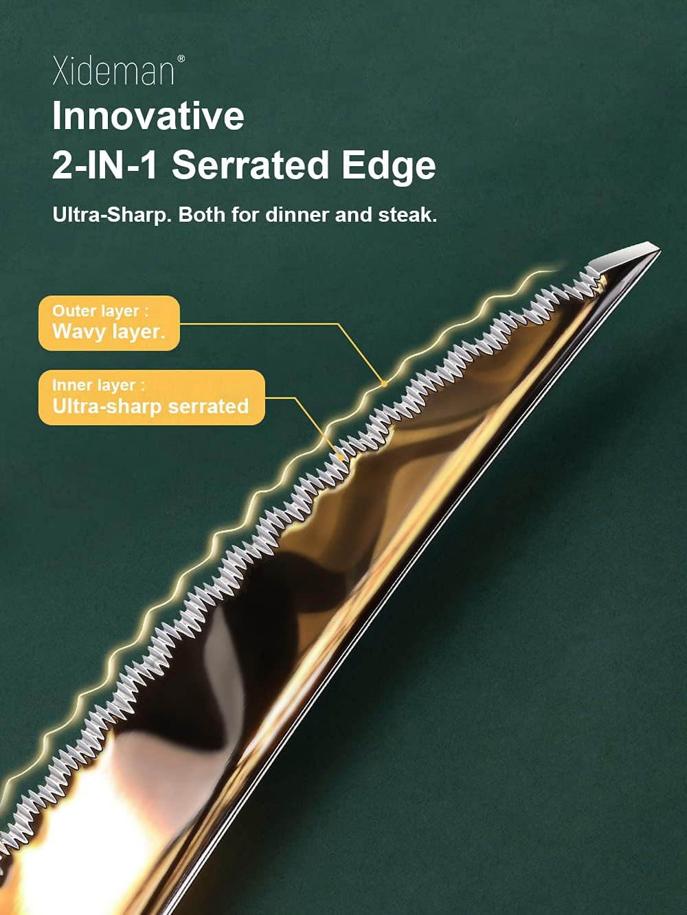 - Included Components : 4 ultra-sharp 2-in-1 serrated knives, 4 dinner fork, 4 dinner spoon, 4 coffee Spoons / mini teaspoons 4 ultra-sharp 2-in-1 serrated knives, 4 dinner fork, 4 dinner spoon, 4 coffee Spoons / mini teaspoons